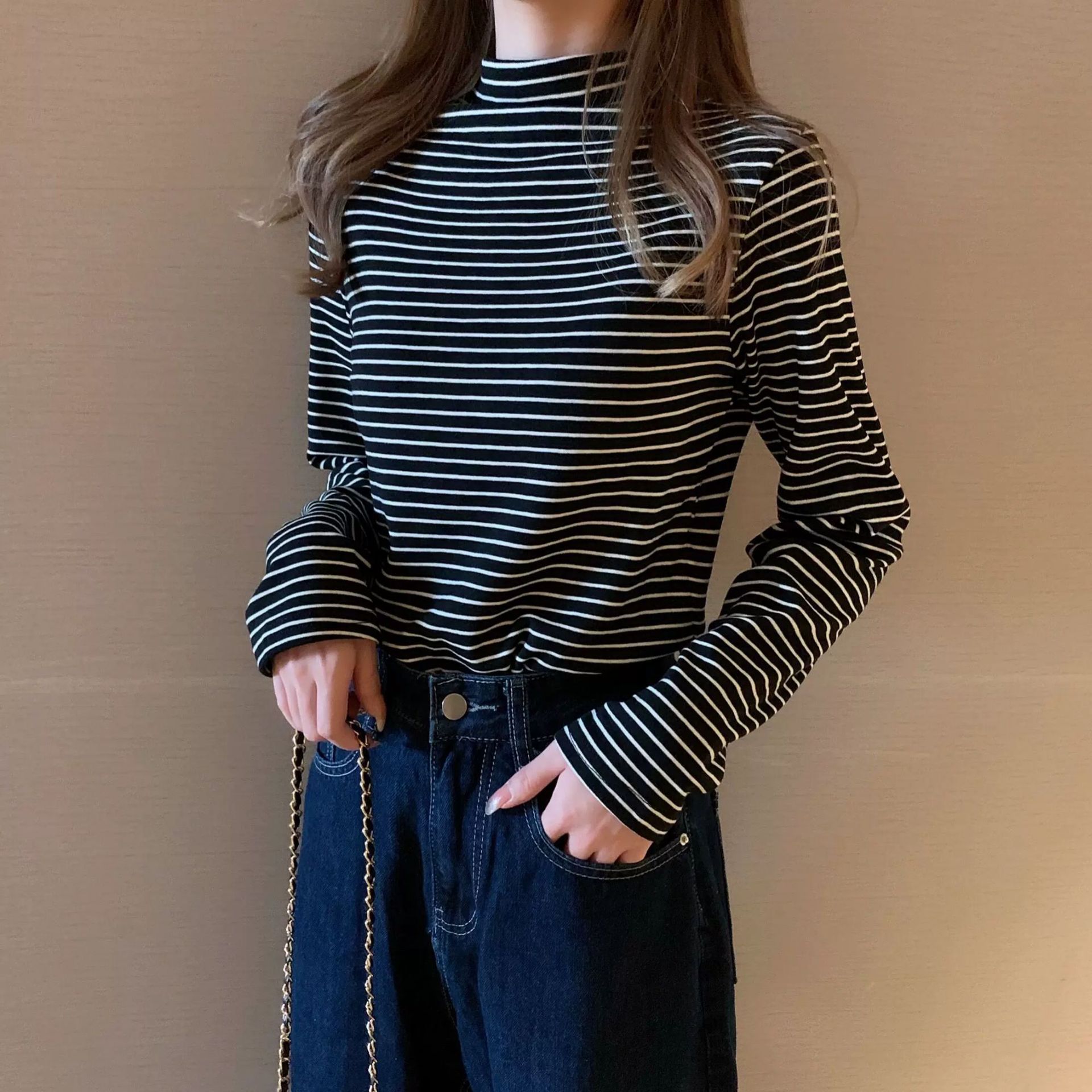 【潮流港風!限時特惠買一送二!每件均價僅333元!】條紋長袖德絨半高領打底衫