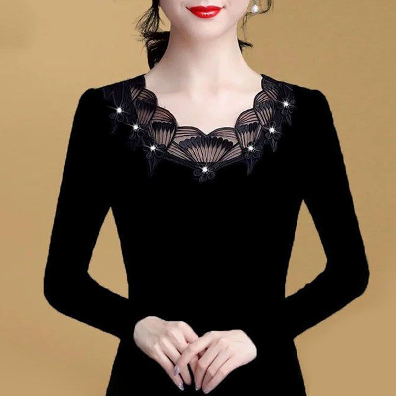 【加絨保暖!特惠買一送一!貨到滿意再付款!】水晶燙鑽蕾絲黑色網紗打底衫