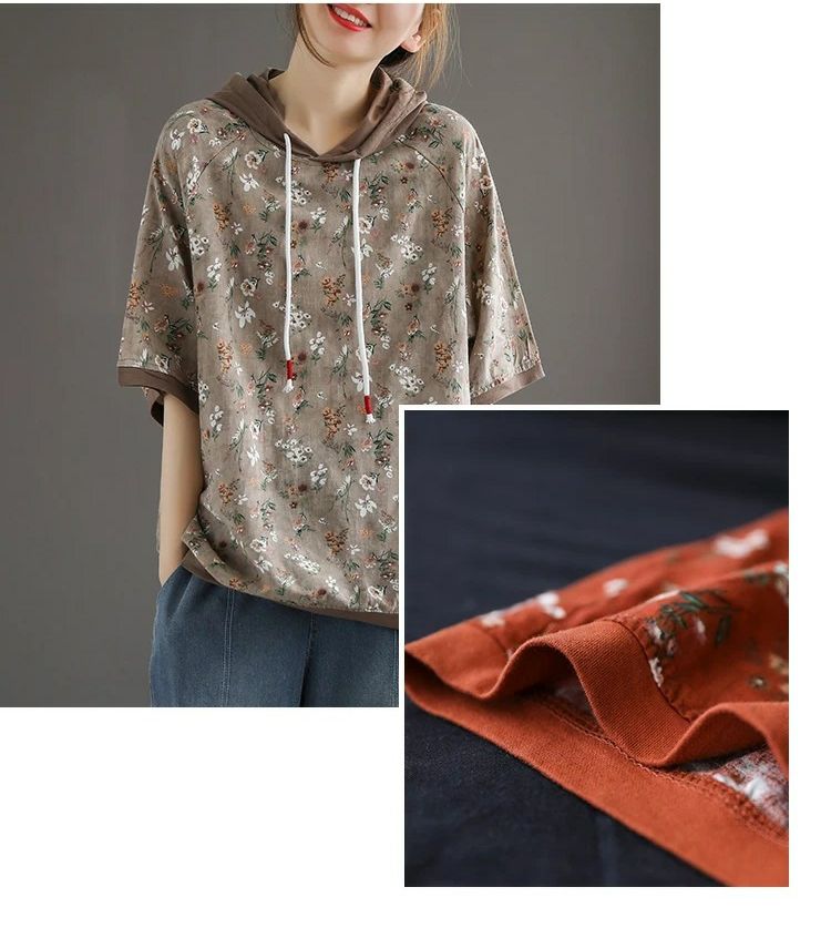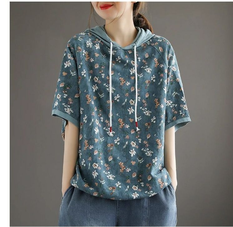 連帽復古文藝碎花寬鬆短袖上衣【買一送一】【藍色】+【卡其色】各一件(每件僅需499元)