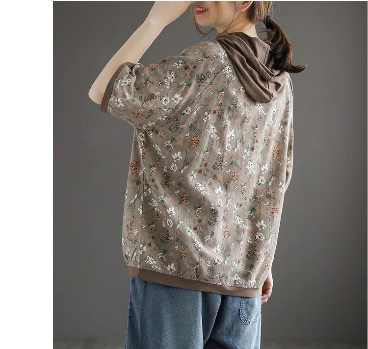 連帽復古文藝碎花寬鬆短袖上衣【買一送一】【卡其色】兩件(每件僅需499元)