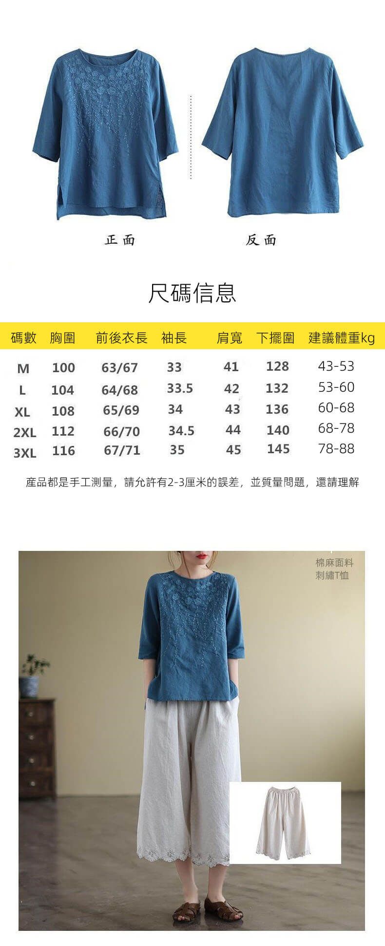 重磅好料棉麻純色刺繡寬鬆上衣【買一送一】【藍色】+【粉色】各一件(到手兩件,每件均價549元)