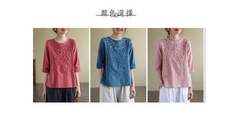 重磅好料棉麻純色刺繡寬鬆上衣【加200秒殺3件!】【藍色】+【紅色】+【粉色】各一件(到手3件,每件均價432元)