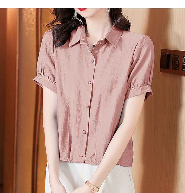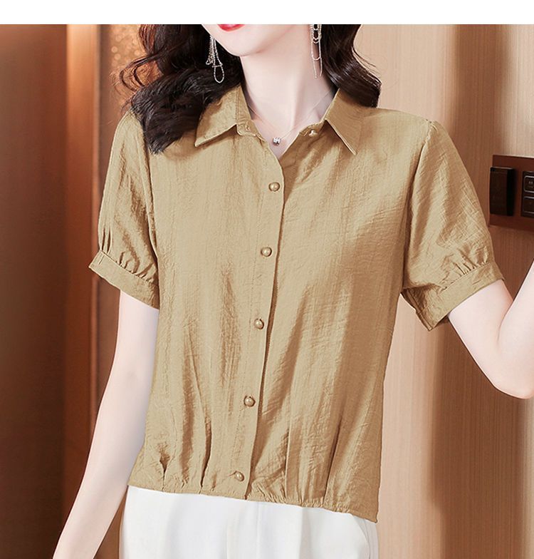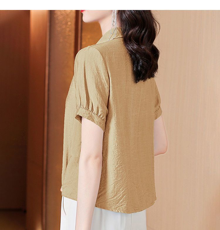 時尚顯瘦洋氣棉麻純色短袖襯衫【買一送一】【卡其色】+【粉色】各一件(到手兩件,每件均價549元!)