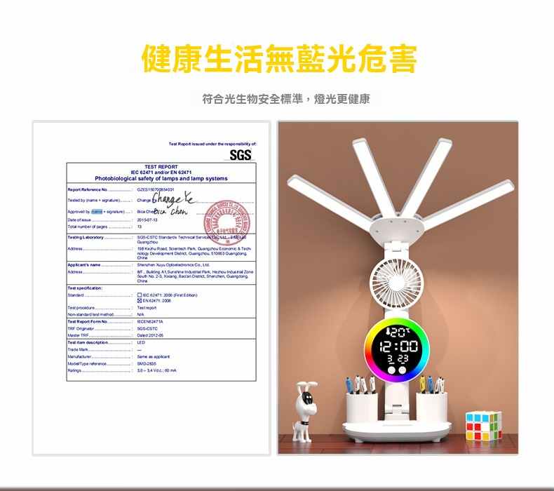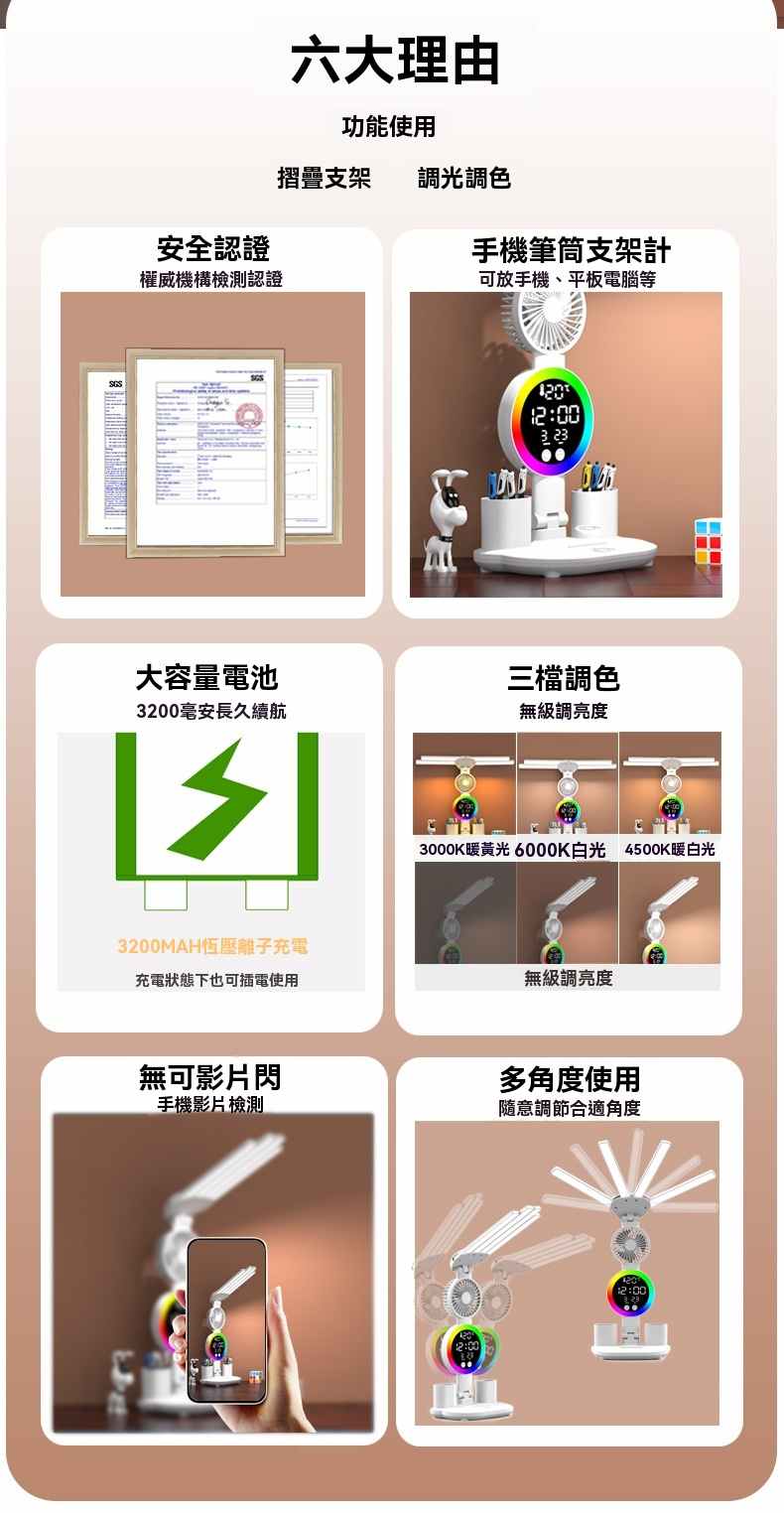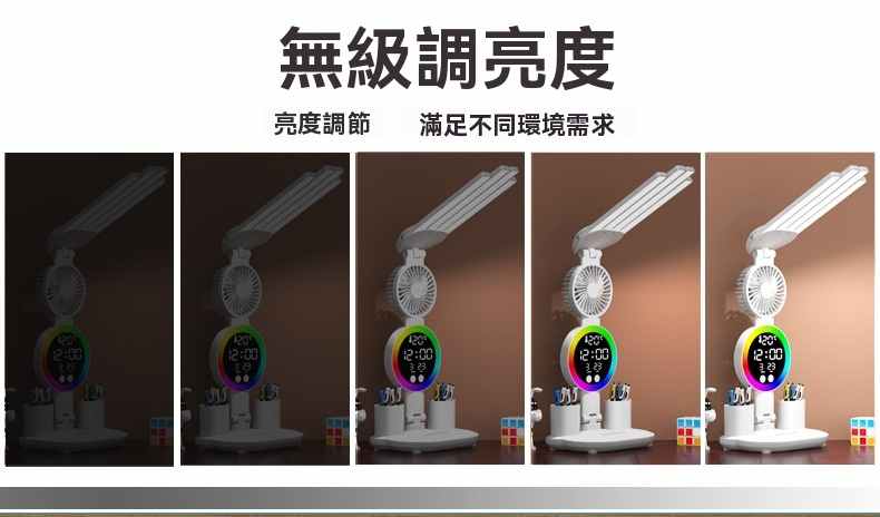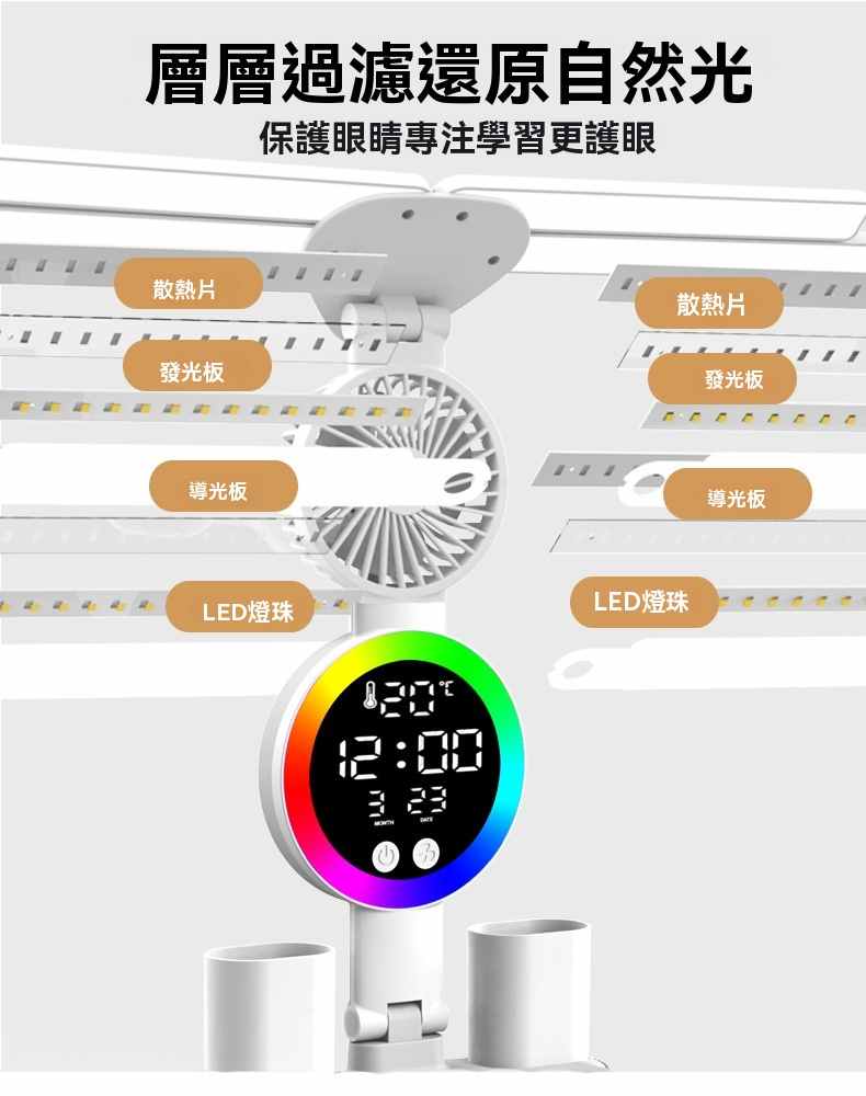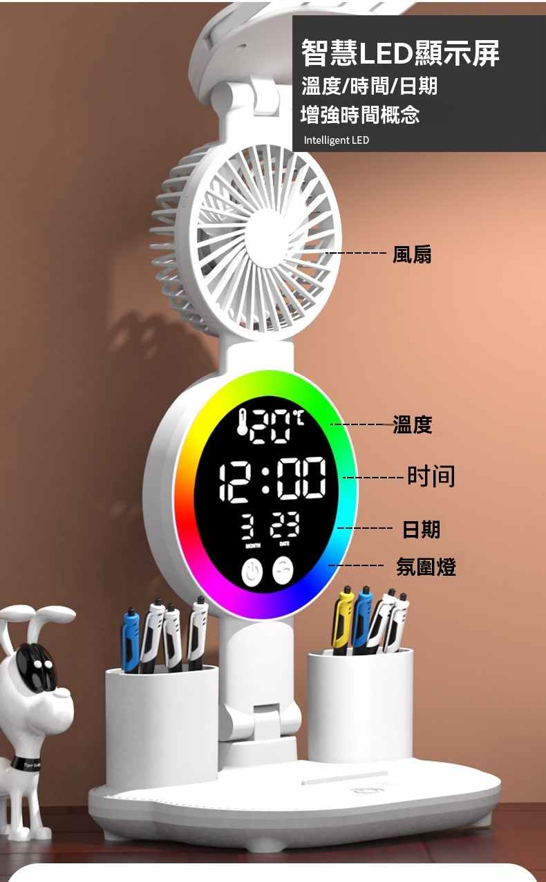 智能LED顯示屏多功能護眼檯燈(4頭氛圍燈-風扇時鐘-3200毫安鋰電池-充電款+贈送usb線)1組