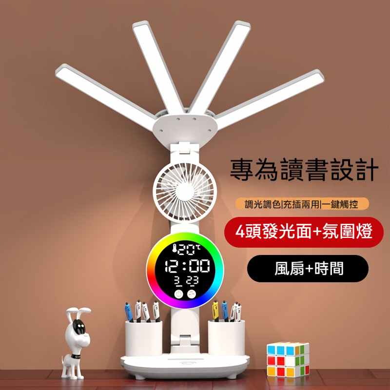 智能LED顯示屏多功能護眼檯燈(4頭氛圍燈-風扇時鐘-3200毫安鋰電池-充電款+贈送usb線)1組