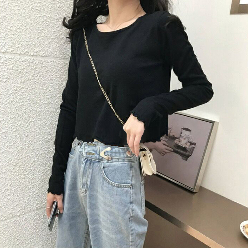 木耳邊韓版修身高彈長袖上衣【買一送一】黑色兩件(到手2件!每件均價400元!)