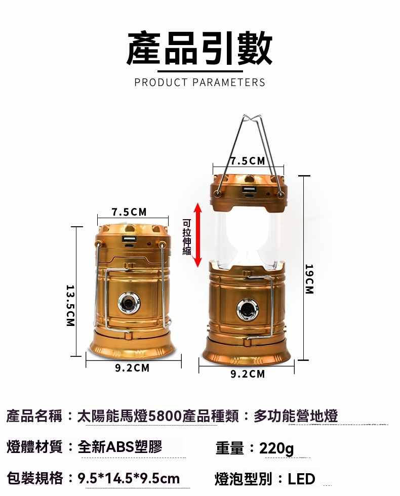 太陽能多功能戶外便攜式露營燈【買一送一】金色+黑色各一組(到手2組,每組均價399元!)
