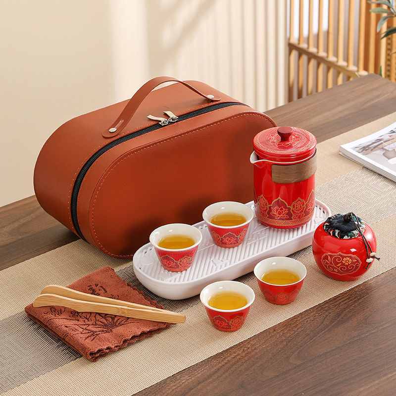 陶瓷套裝【玫紅】一壺四杯+罐巾夾+橢圓包+盤一組
