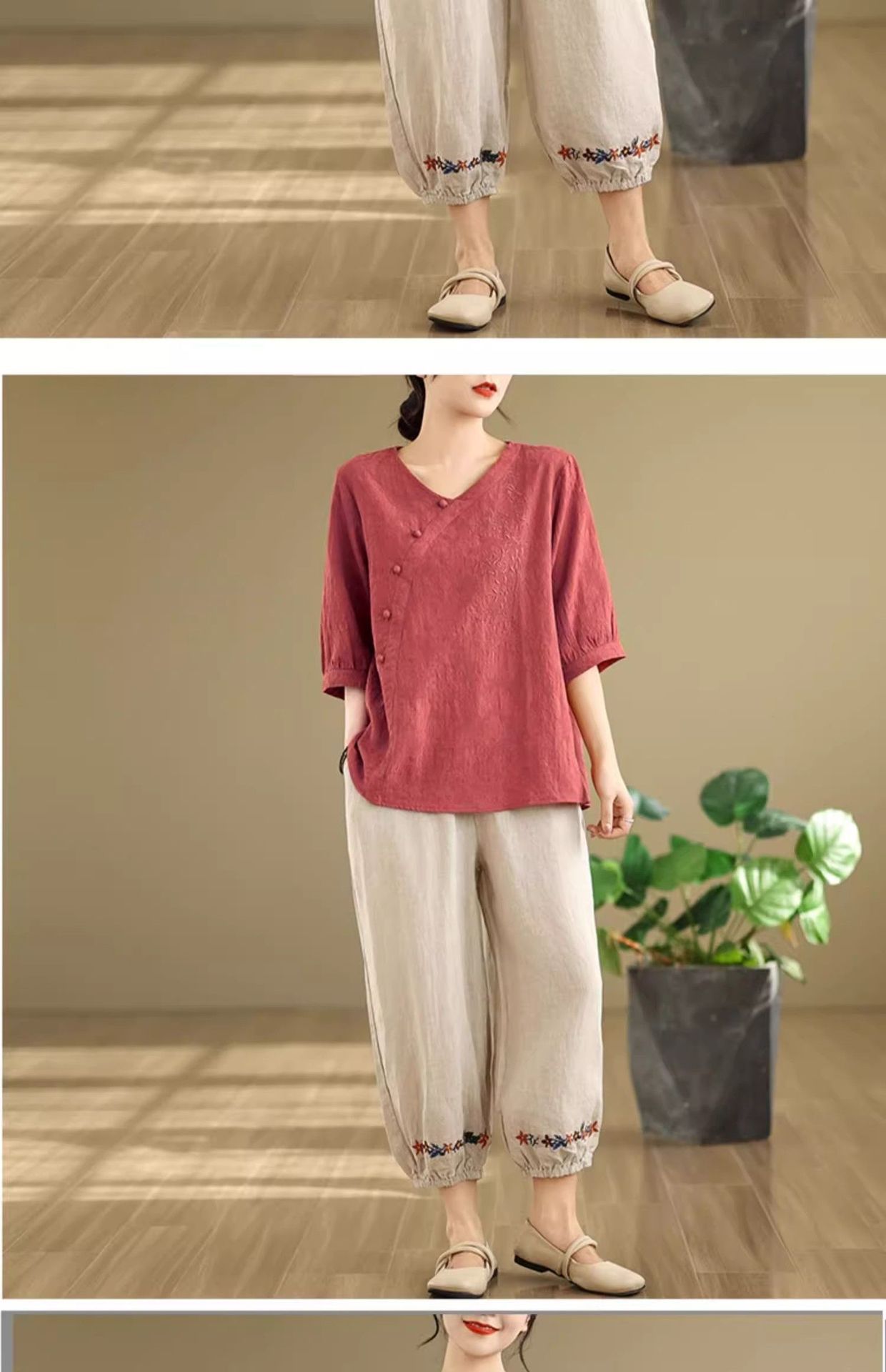 新中式媽媽棉麻刺繡上衣【買一送一】【紅色】+【紫色】各一件(到手兩件,每件均價649元)