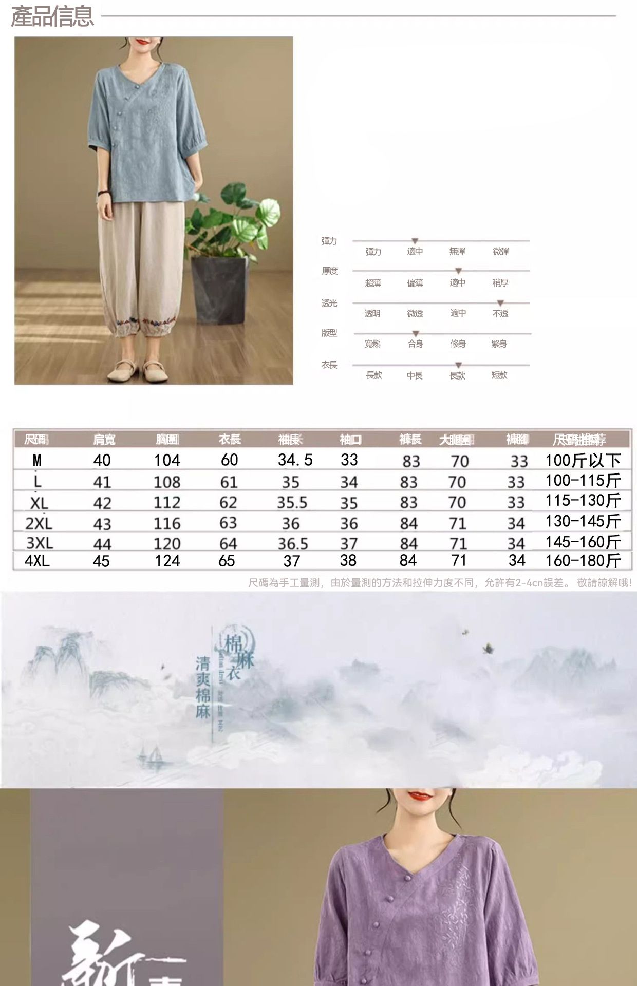 新中式媽媽棉麻刺繡上衣【買一送一】【藍色】+【紫色】各一件(到手兩件,每件均價649元)