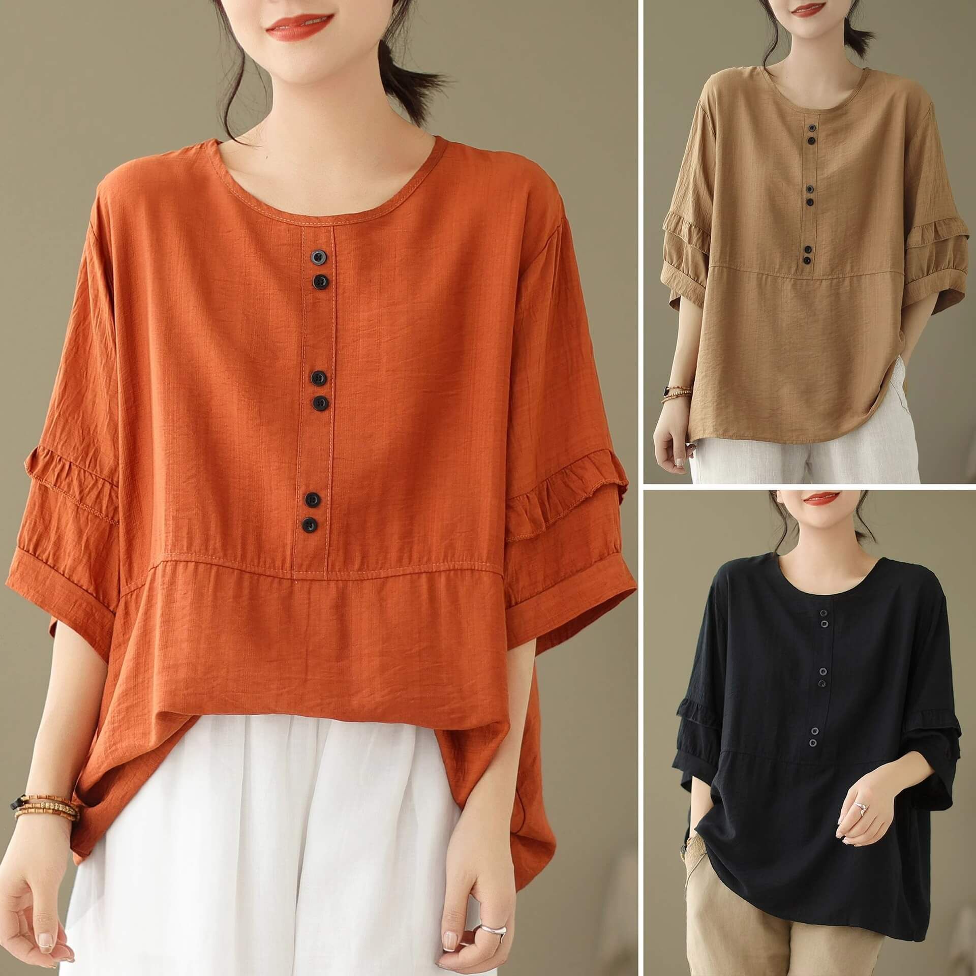 【全台免運!限時特惠買一送一!】涼快寬鬆花邊領紐扣棉麻上衣