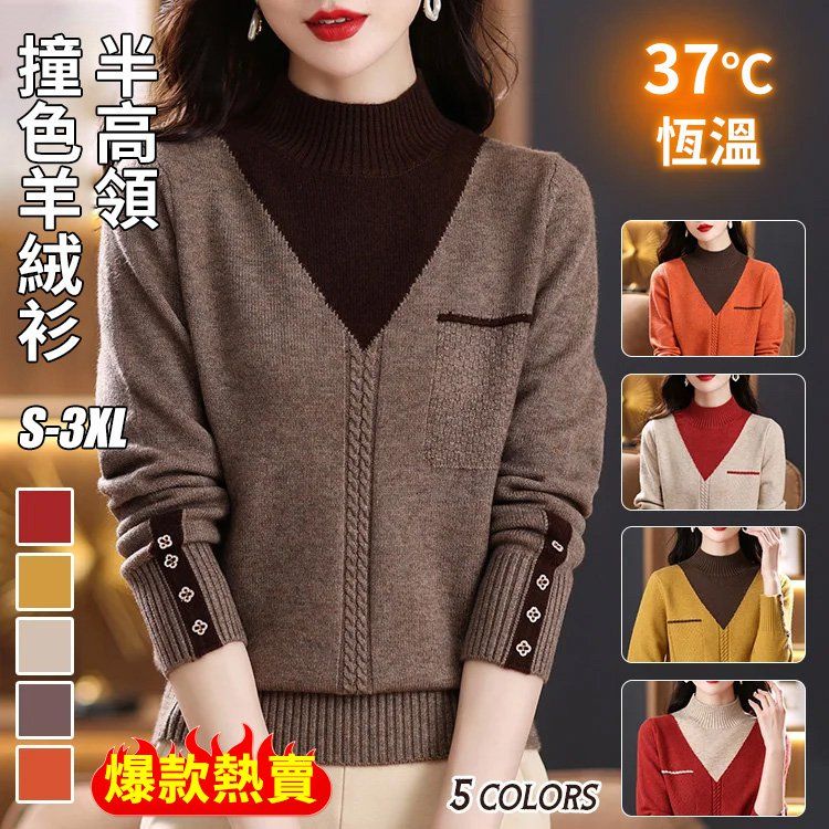 【今年超流行的洋氣時尚毛衣!廠家感恩回饋限時買一送一!】假兩件半高領撞色羊絨衫