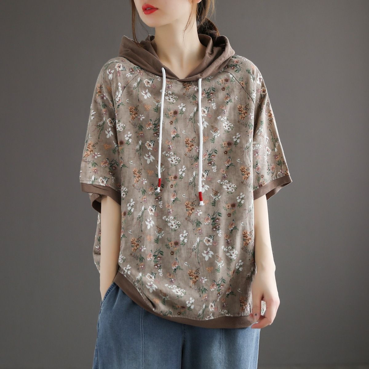 【特惠買一送一!穿上顯年輕!】連帽復古文藝碎花寬鬆短袖上衣