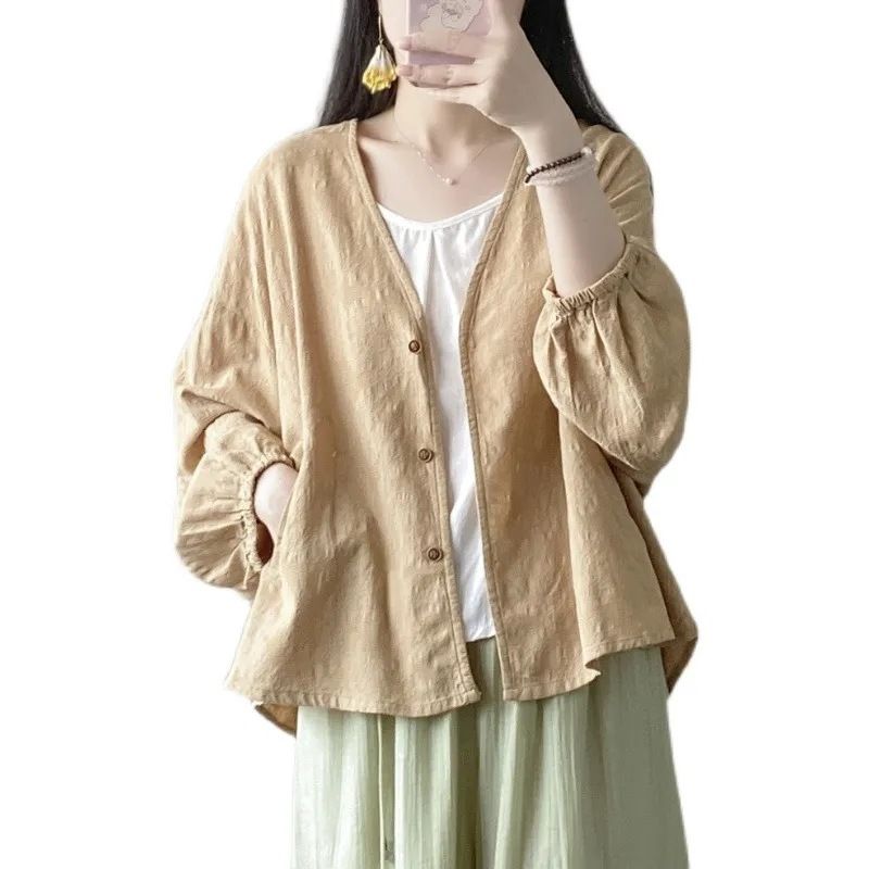 【舒適寬鬆顯氣質!新款買一送一!全台免運!】棉麻提花V領長袖外套