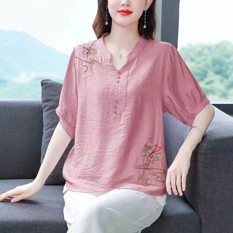 【有點貴但是質量真的好!全台免運!】中式立領蝴蝶結刺繡七分袖棉麻襯衣