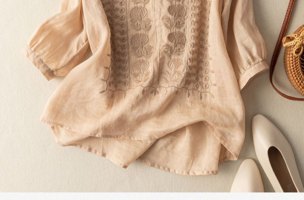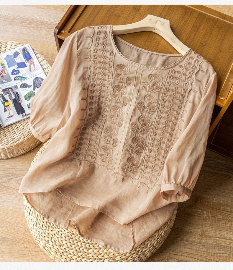 刺繡復古女士中袖上衣【買一送一】【藍色】+【卡其色】各一件(每件低至649元)
