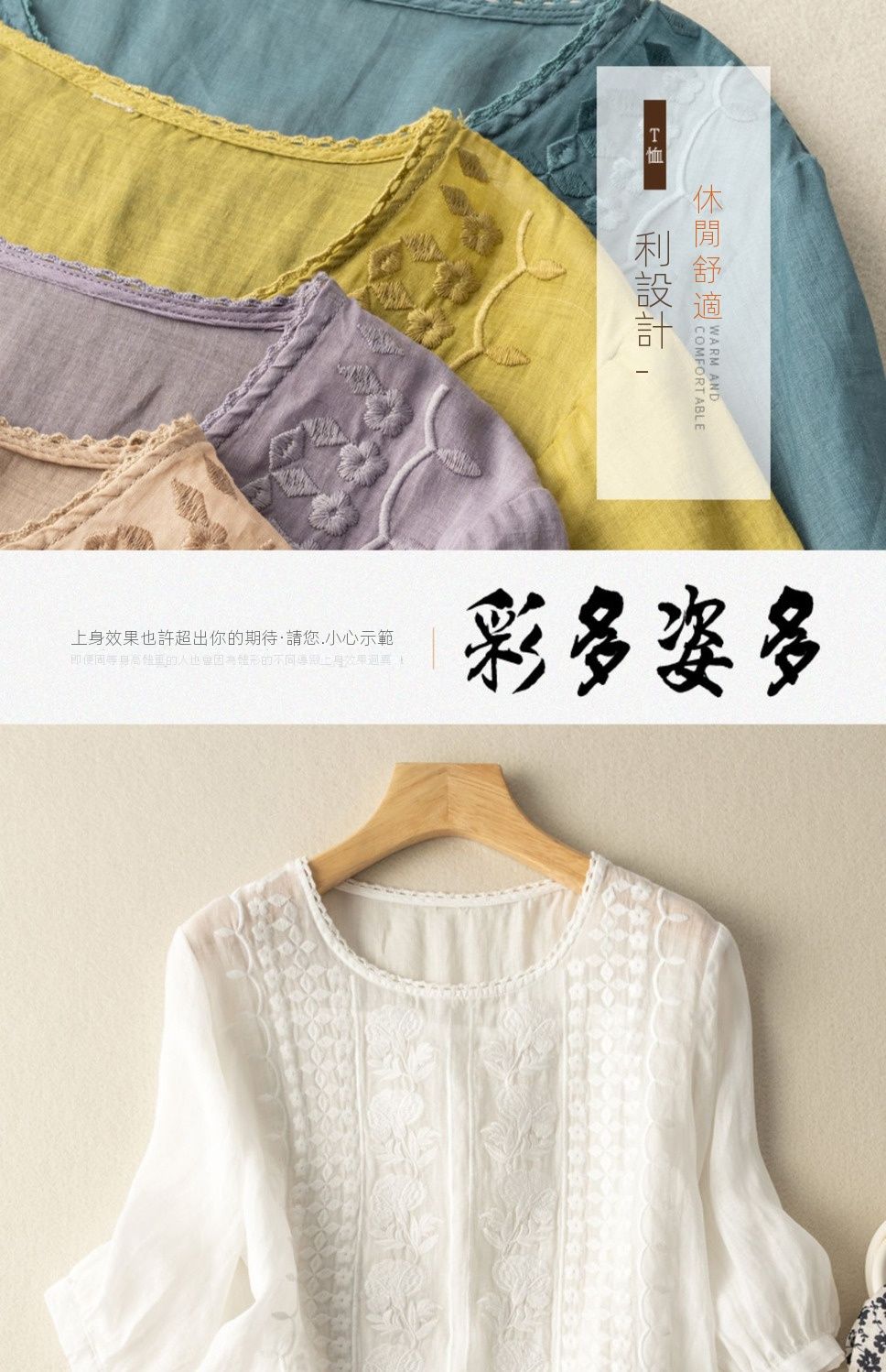 刺繡復古女士中袖上衣【秒殺5件!】【白色】+【藍色】+【紫色】+【黃色】+【卡其色】各一件(每件低至500元)
