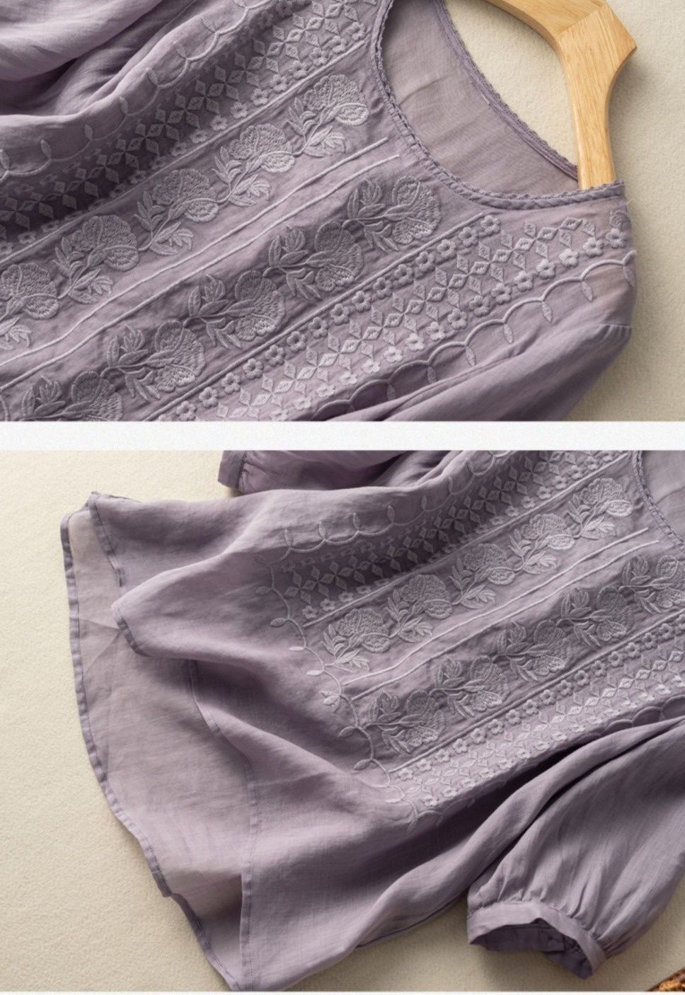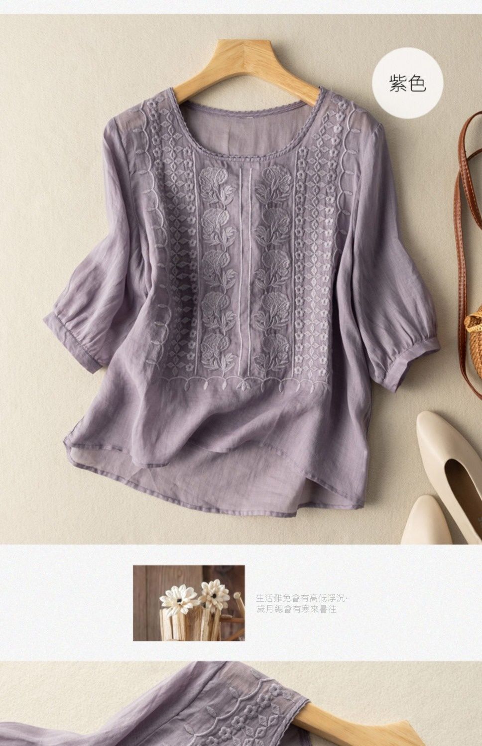 刺繡復古女士中袖上衣【買一送一】【紫色】+【卡其色】各一件(每件低至649元)