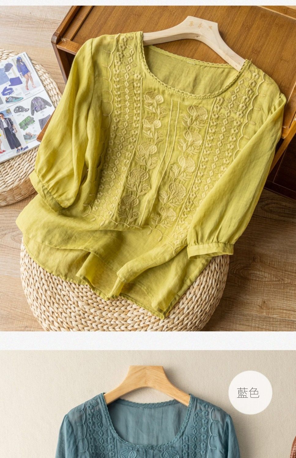 刺繡復古女士中袖上衣【買一送一】【藍色】+【黃色】各一件(每件低至649元)