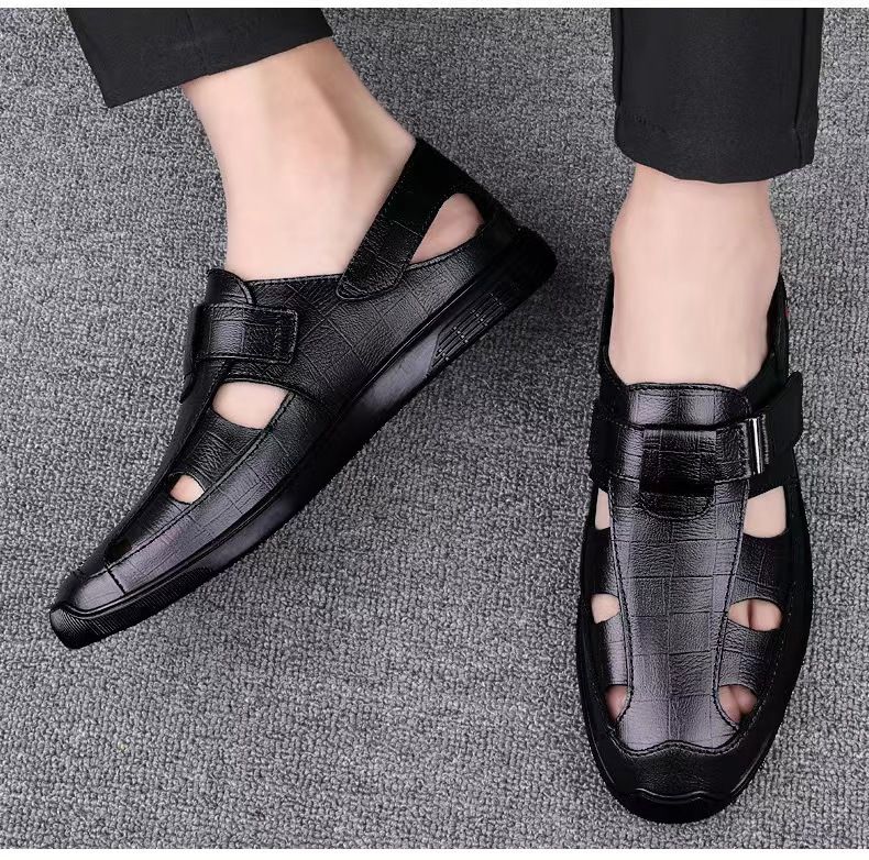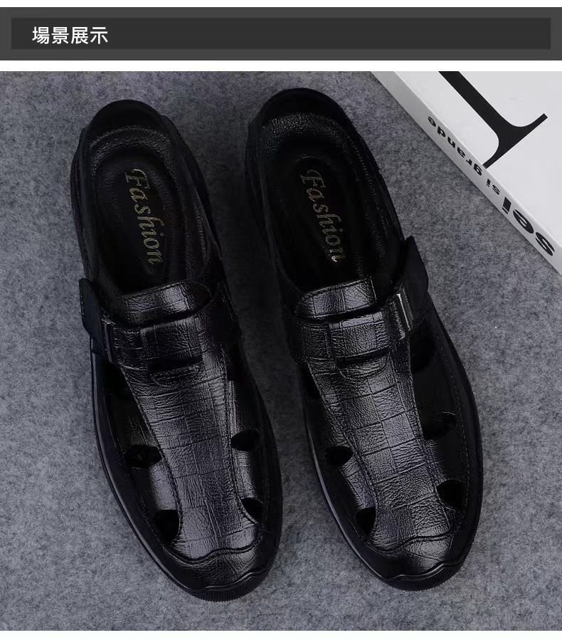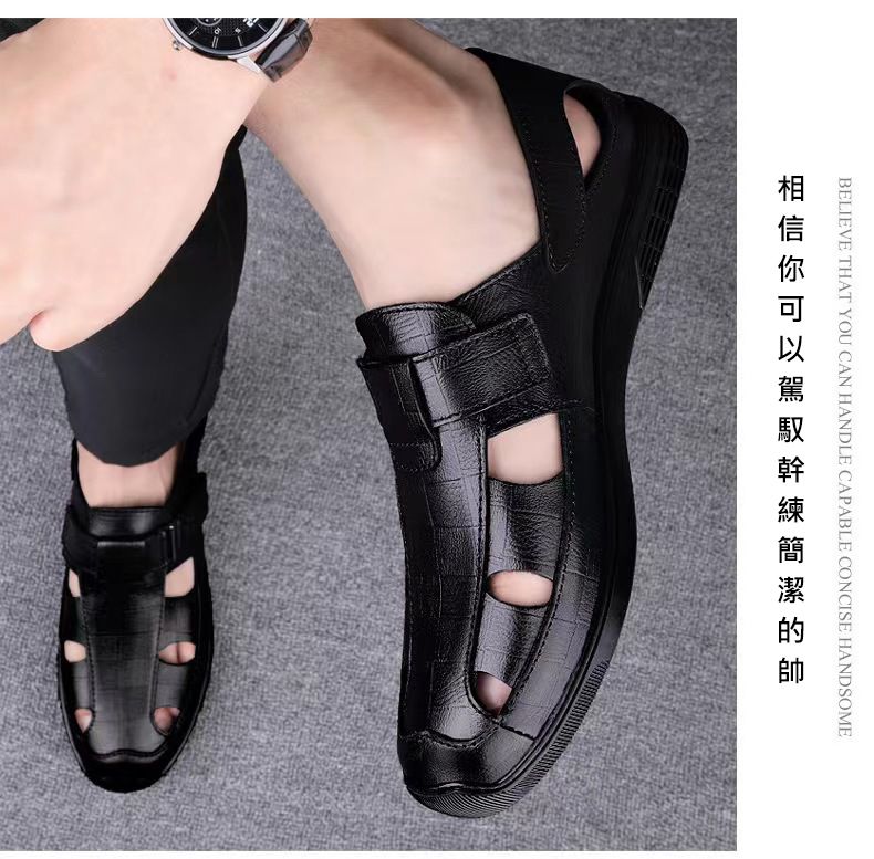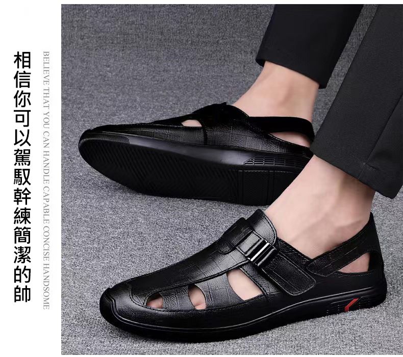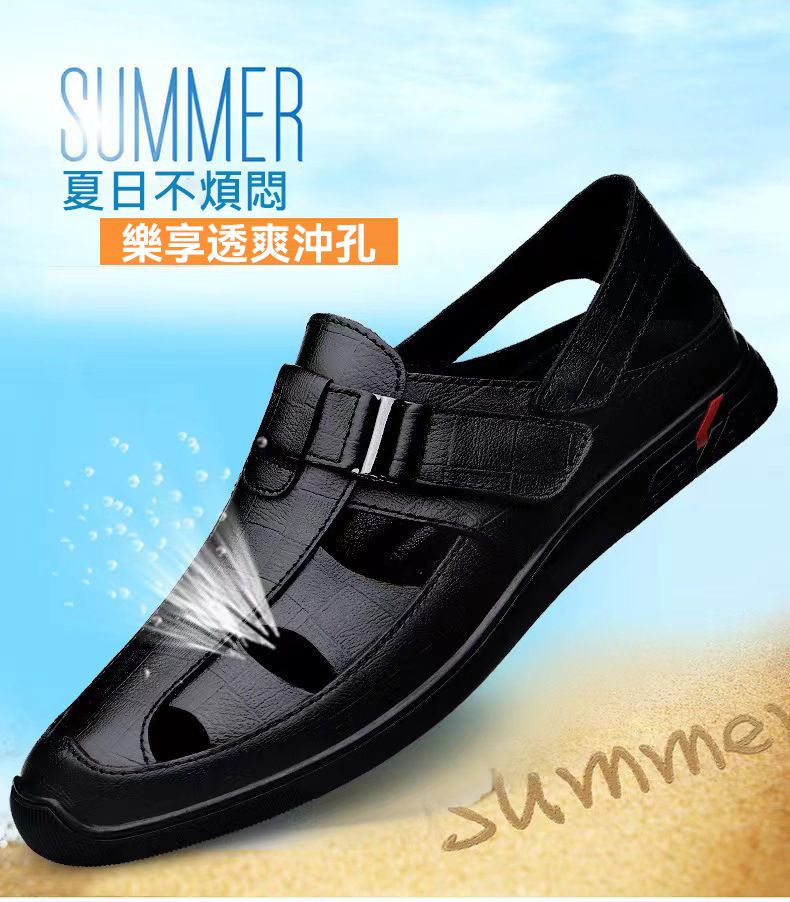 新款男士乾爽透氣軟底皮涼鞋【買一送一】【黑色】兩雙