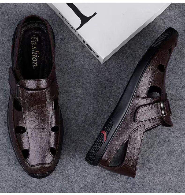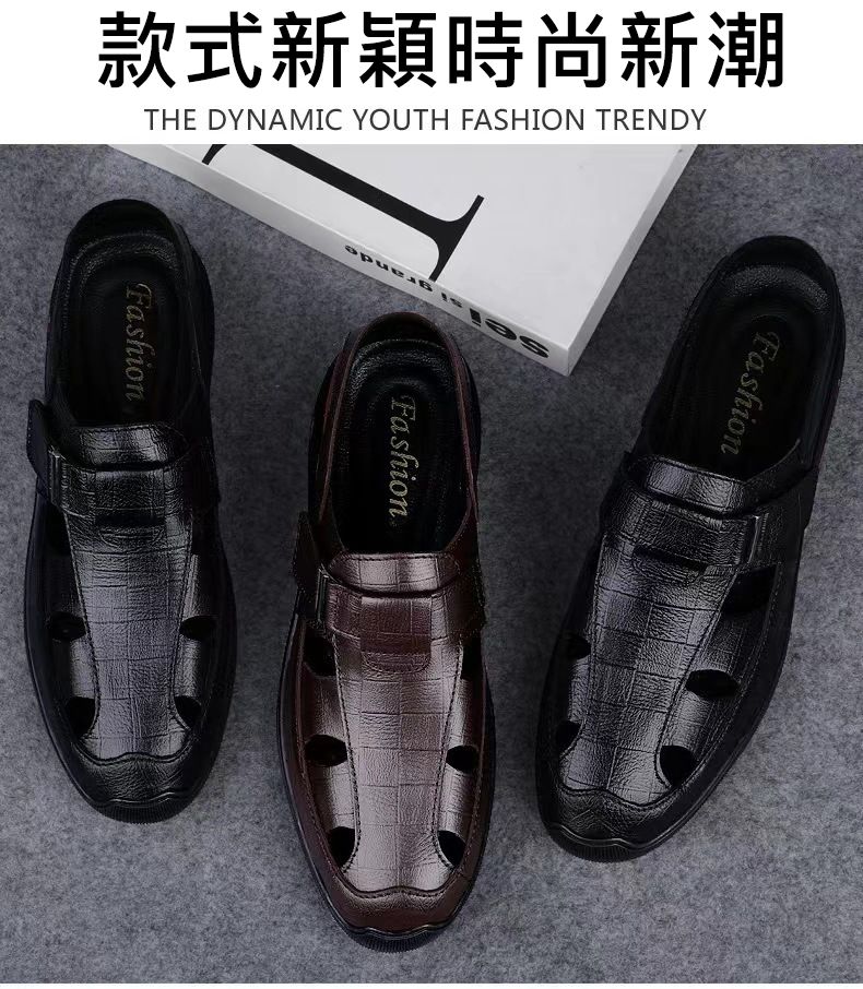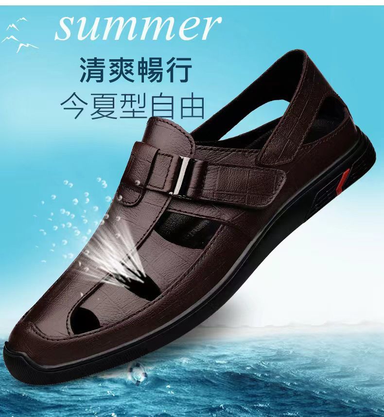 新款男士乾爽透氣軟底皮涼鞋【買一送一】【黑色】+【棕色】各一雙
