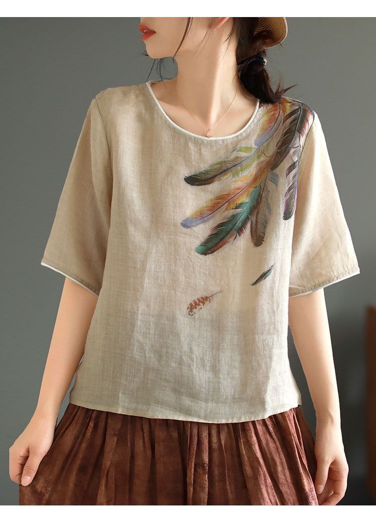 復古印花高端棉麻T恤【秒殺4件】原麻色+禪綠色+象牙白+藕色各一件(每件399元)