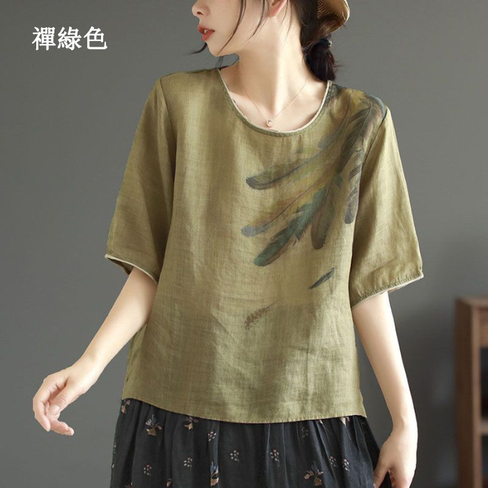 復古印花高端棉麻T恤【買一送一】禪綠色+藕色各一件(每件499元)