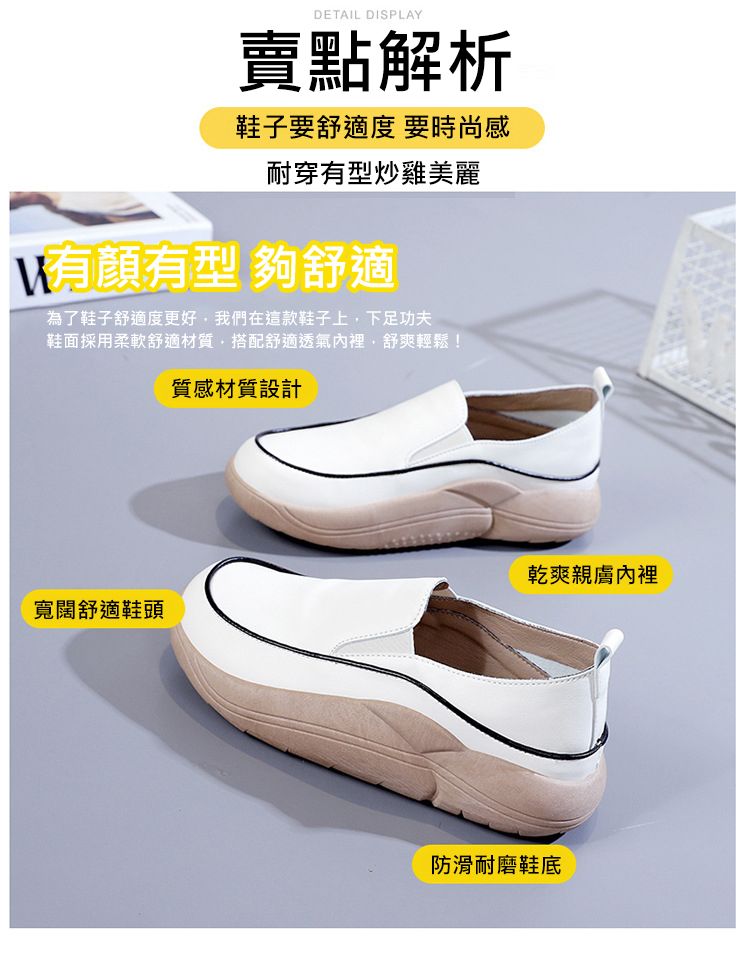 【純色皮革】女士一腳蹬厚底增高休閒小皮鞋【白色】+【棕色】各一雙(優惠400)