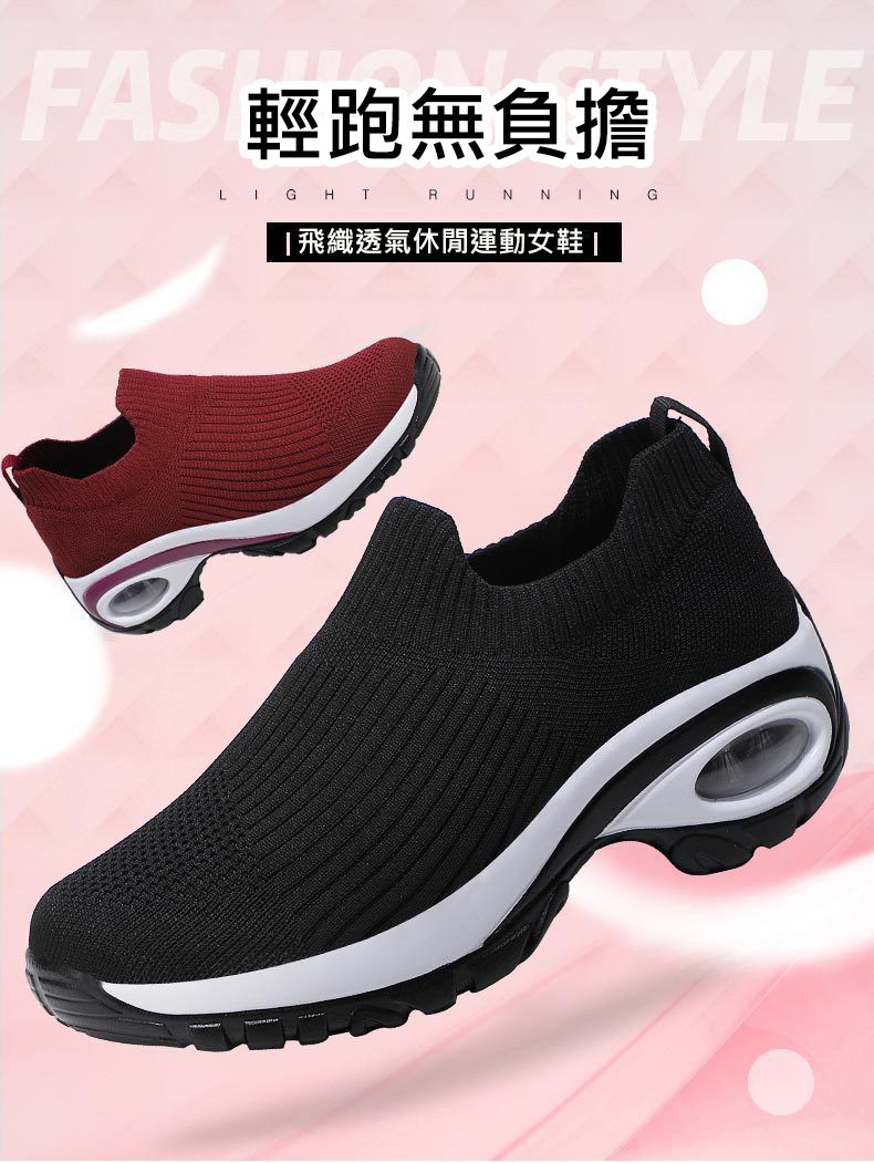 【PU氣墊減震】女士休閒百搭飛織透氣一腳蹬跑步鞋【紅色】+【黑色】各一雙(優惠400)