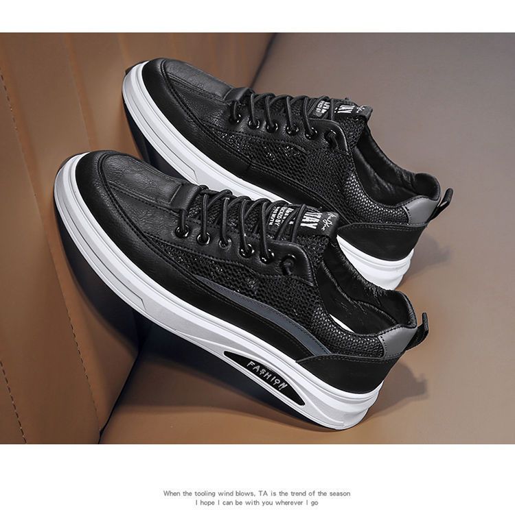 【透光透氣百搭】春季新款男士皮革網布運動鞋【黑色】一雙
