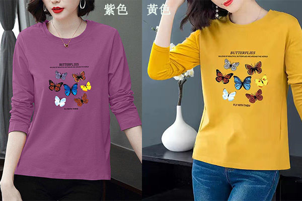 蝴蝶圖案寬鬆大碼長袖T恤【買一送二】【紫色】+【紅色】+【黃色】各一件(每件僅需333元)