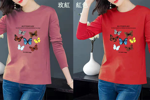 蝴蝶圖案寬鬆大碼長袖T恤【買一送二】【紫色】+【紅色】+【玫紅色】各一件(每件僅需333元)