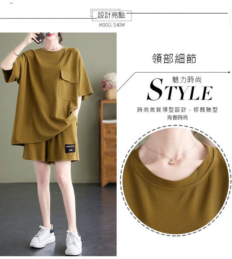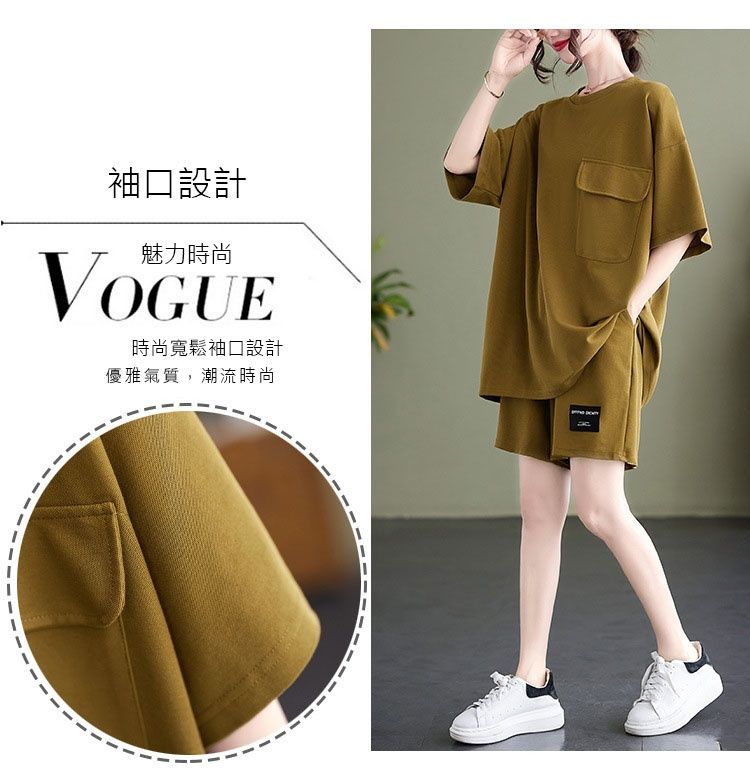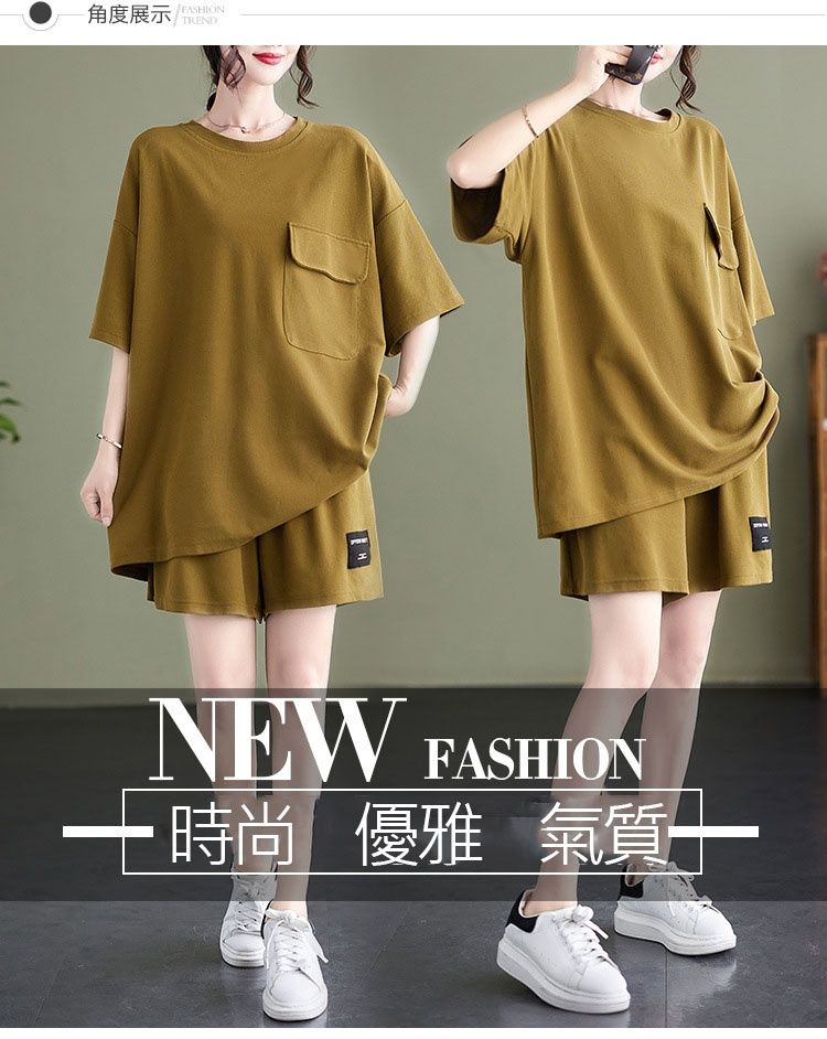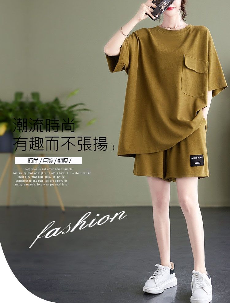 口袋設計時尚女士短袖套裝【買一送一】灰色+黃色各一套(到手兩套,每套均價549元)