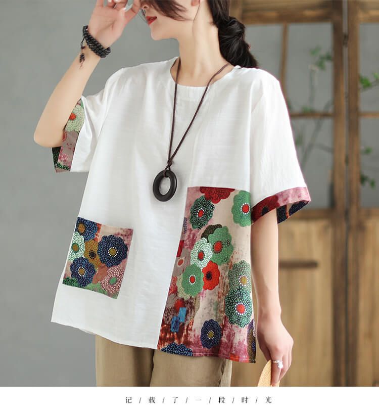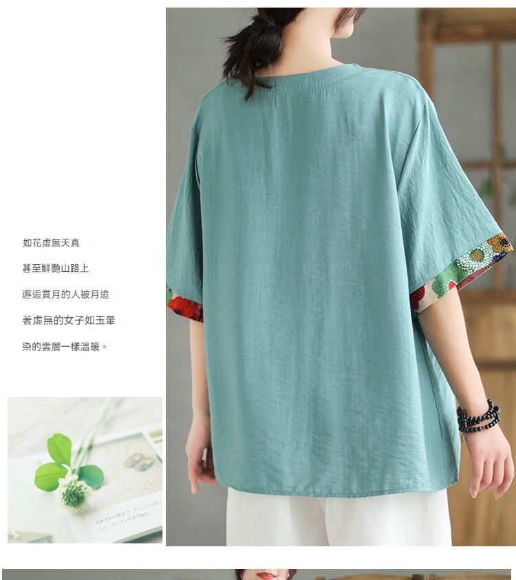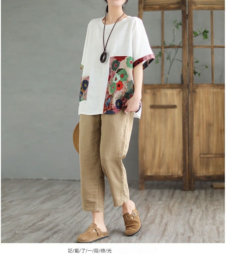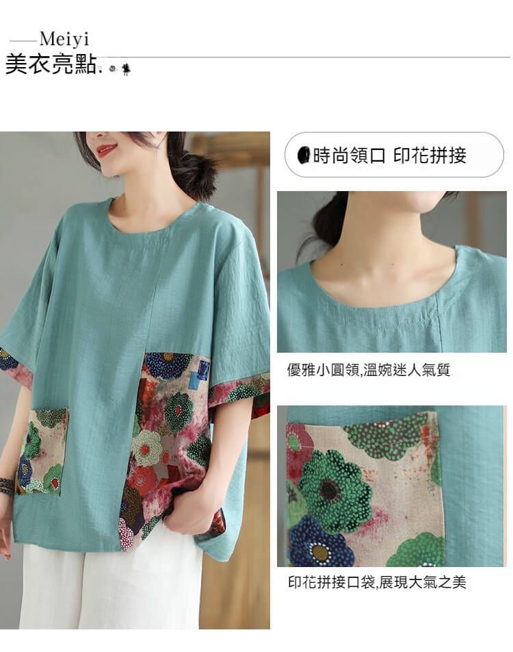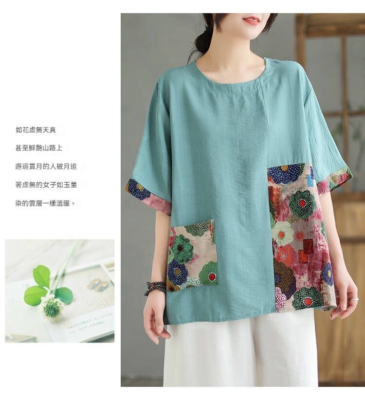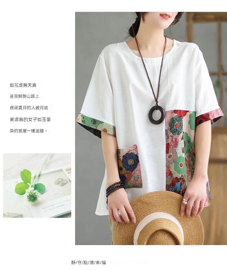 印花拼色大碼寬鬆棉麻上衣【湖藍色】+【白色】各一件(到手兩件,每件均價549元)