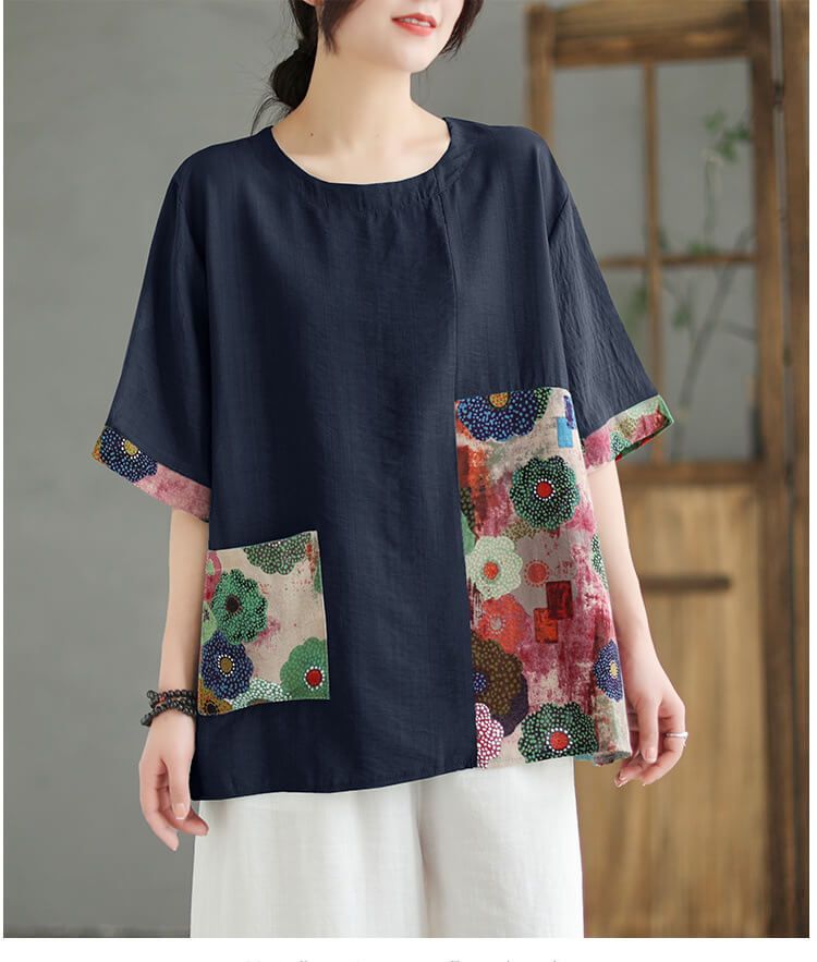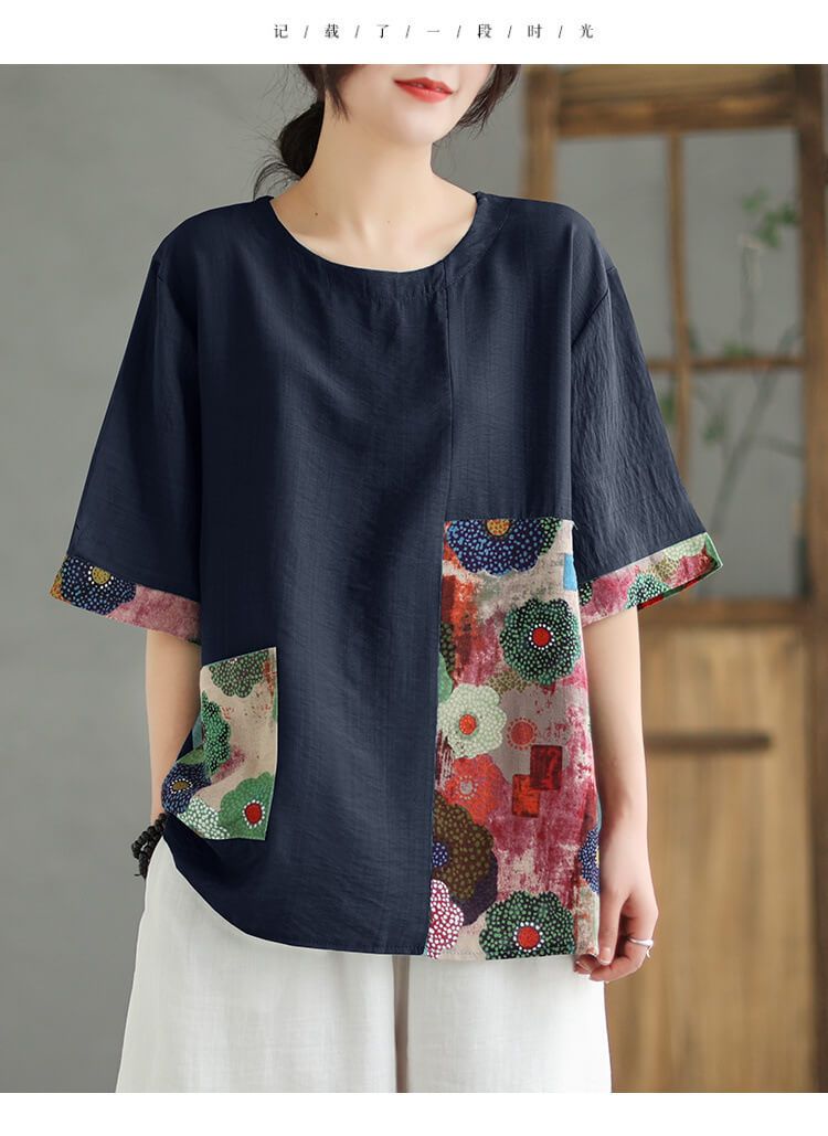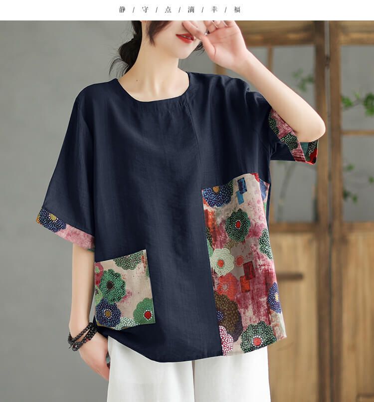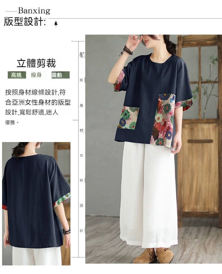 印花拼色大碼寬鬆棉麻上衣【湖藍色】+【黑色】各一件(到手兩件,每件均價549元)