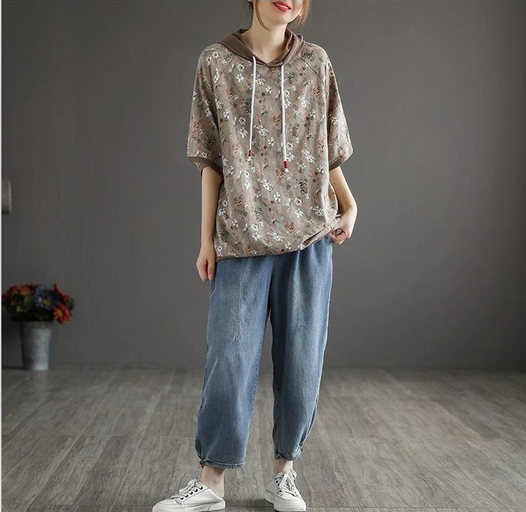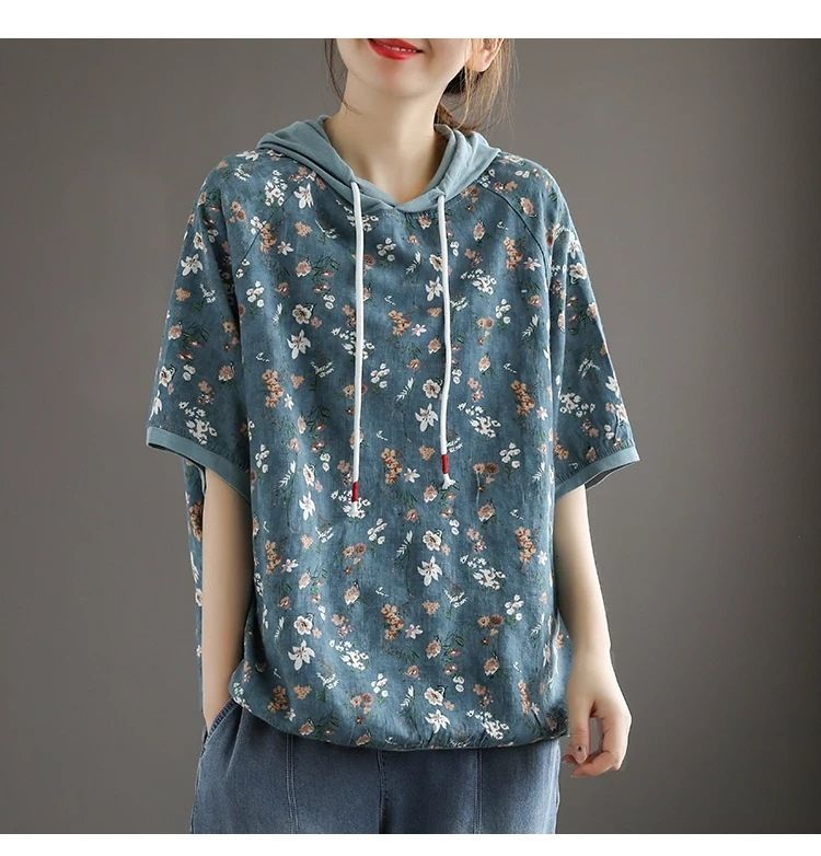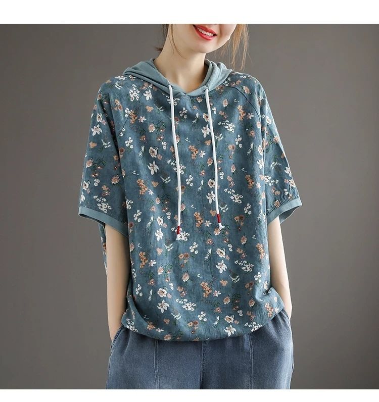 連帽復古文藝碎花寬鬆短袖上衣【買一送一】【藍色】+【卡其色】各一件(每件僅需499元)