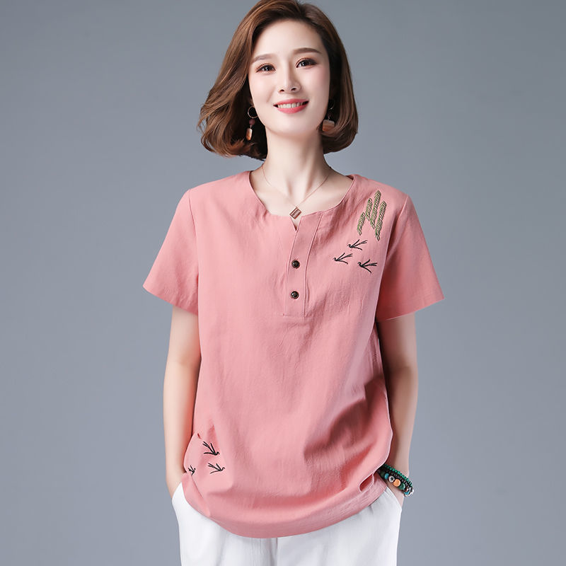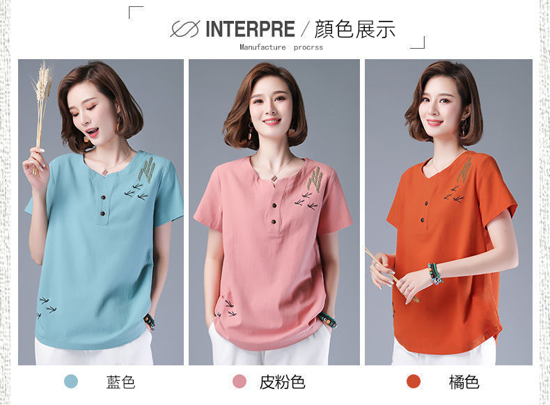 棉麻復古風短袖女士T恤【加200秒殺3件!】粉色+藍色+橘色各一件(到手3件!每件均價432元!)
