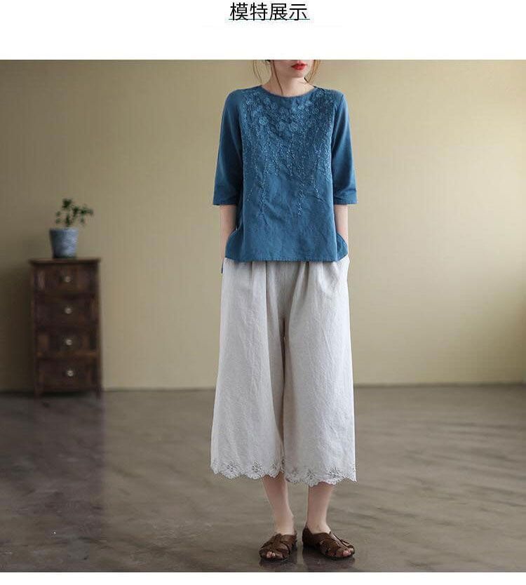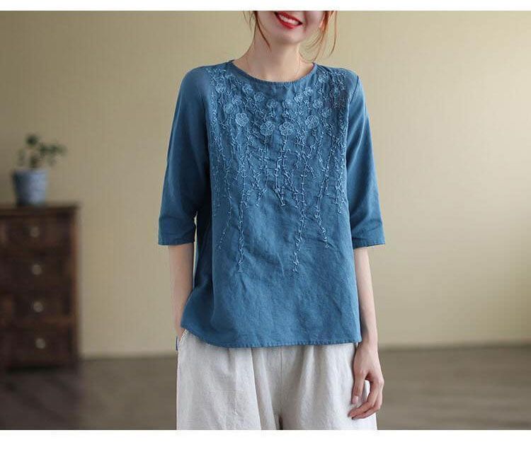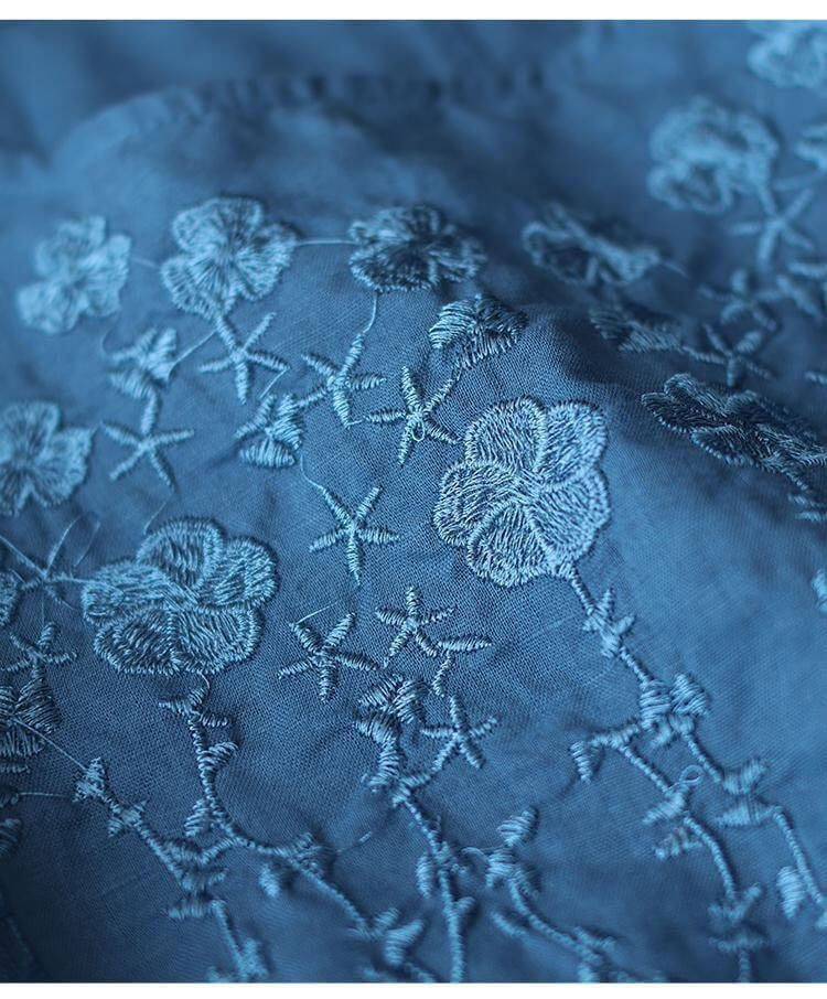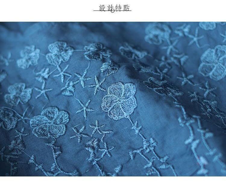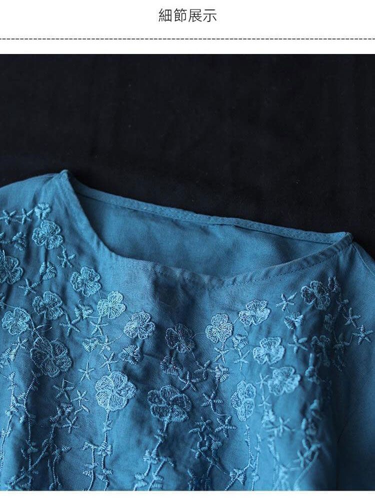 重磅好料棉麻純色刺繡寬鬆上衣【買一送一】【藍色】+【紅色】各一件(到手兩件,每件均價549元)