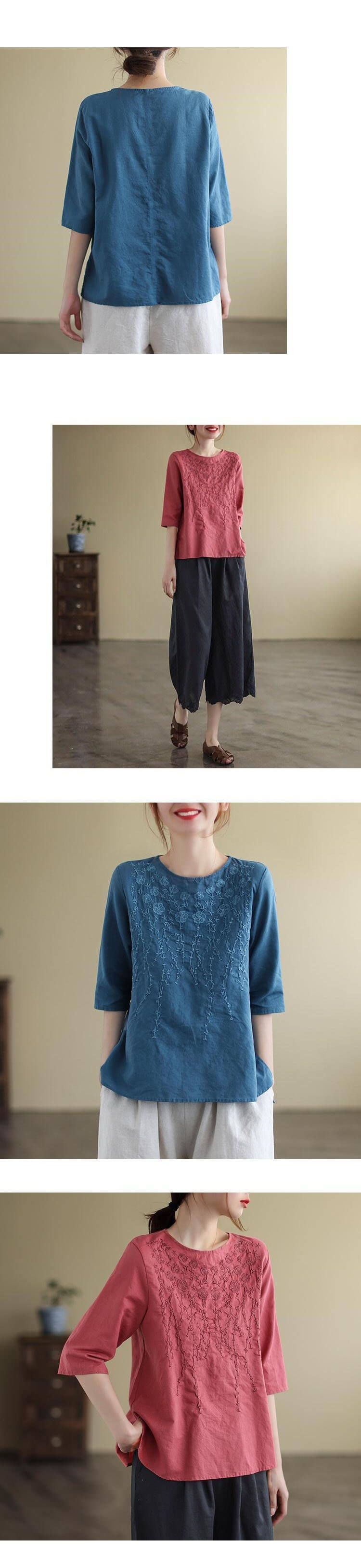 重磅好料棉麻純色刺繡寬鬆上衣【加200秒殺3件!】【藍色】+【紅色】+【粉色】各一件(到手3件,每件均價432元)