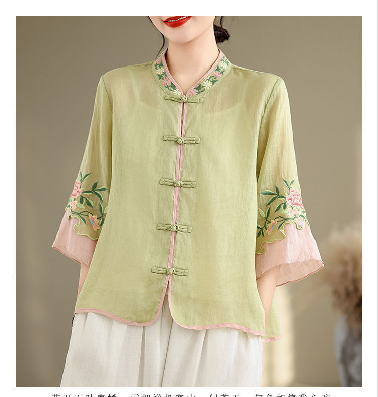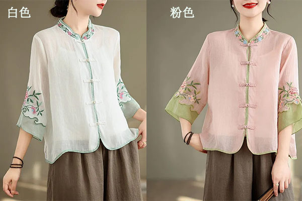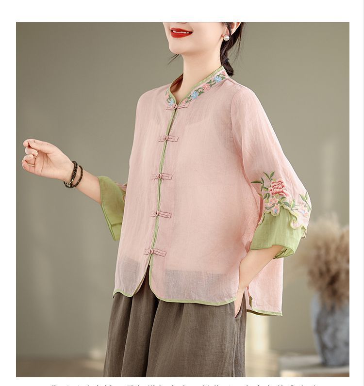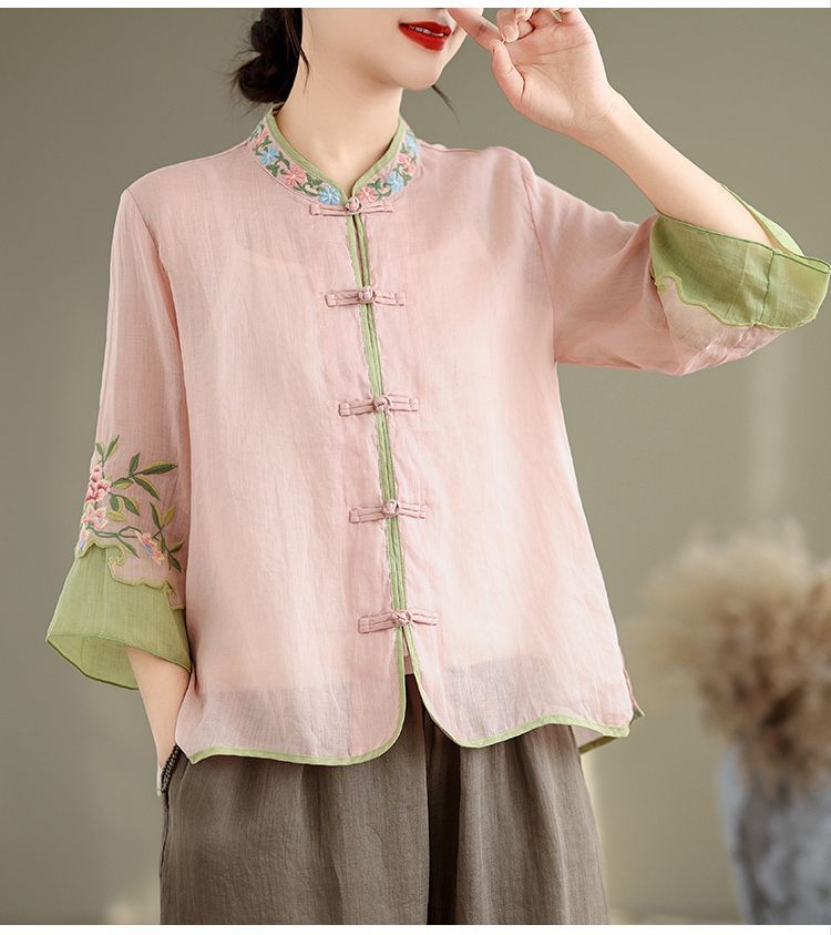 盤扣復古拼色棉麻立領刺繡七分袖上衣【買一送一】【粉色】+【綠色】各一件(到手兩件,每件均價649元)