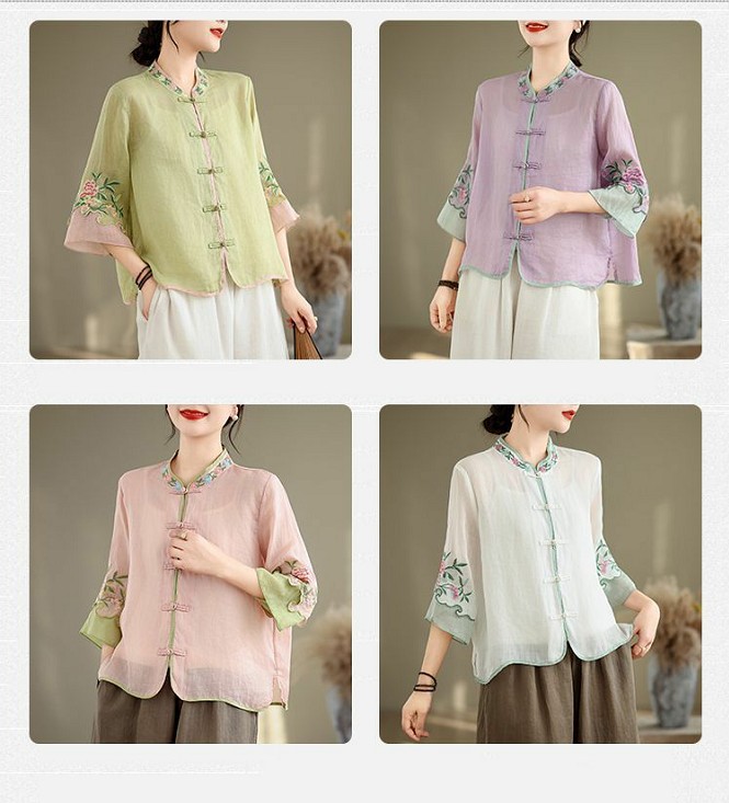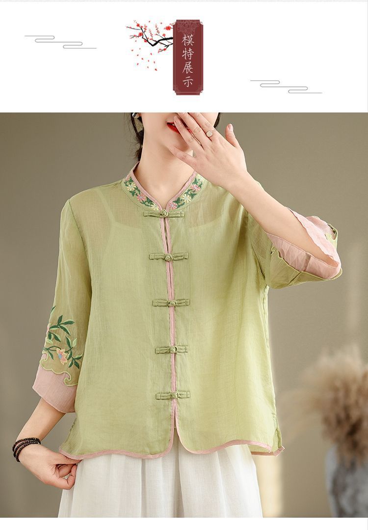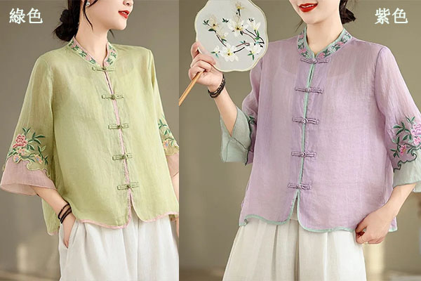 盤扣復古拼色棉麻立領刺繡七分袖上衣【買一送一】【綠色】+【紫色】各一件(到手兩件,每件均價649元)