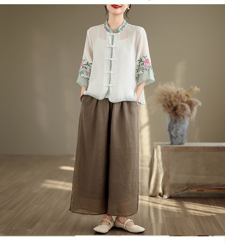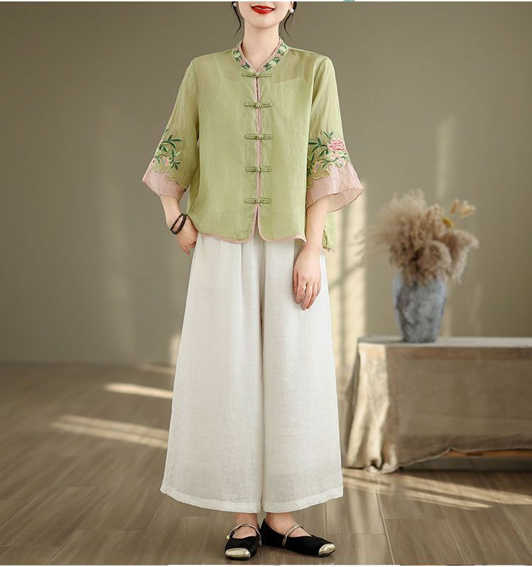 盤扣復古拼色棉麻立領刺繡七分袖上衣【買一送一】【白色】+【綠色】各一件(到手兩件,每件均價649元)