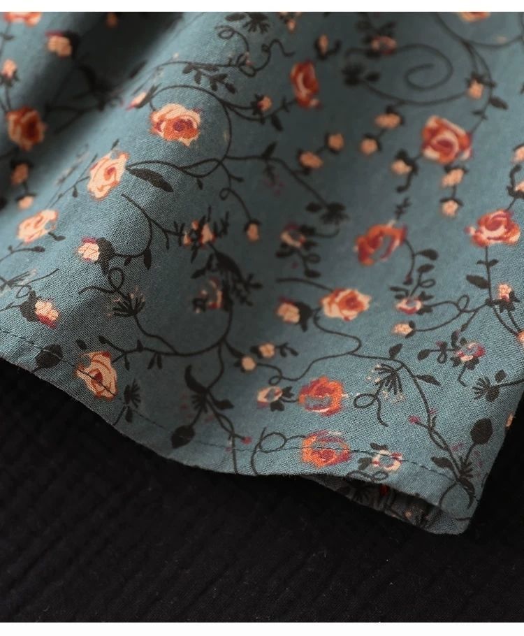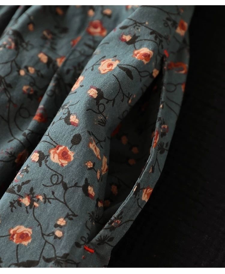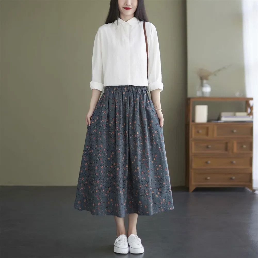 高腰顯瘦中長款棉麻碎花裙【買一送一】【灰藍色】+【深卡色】各一條(到手兩條,每條均價549元)