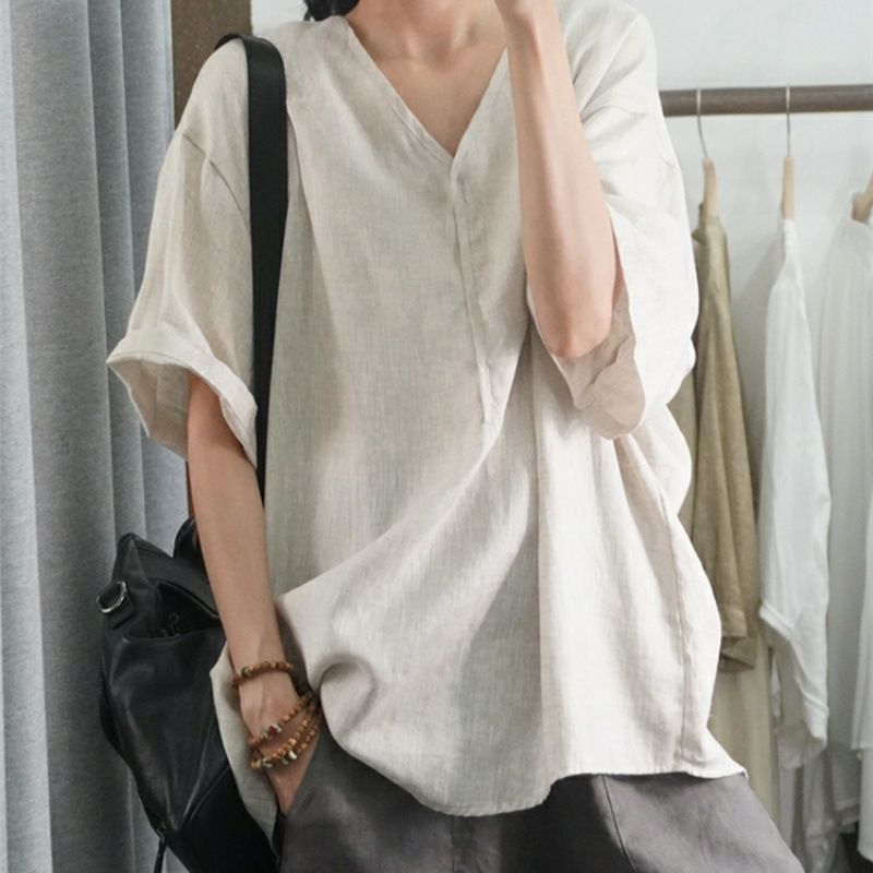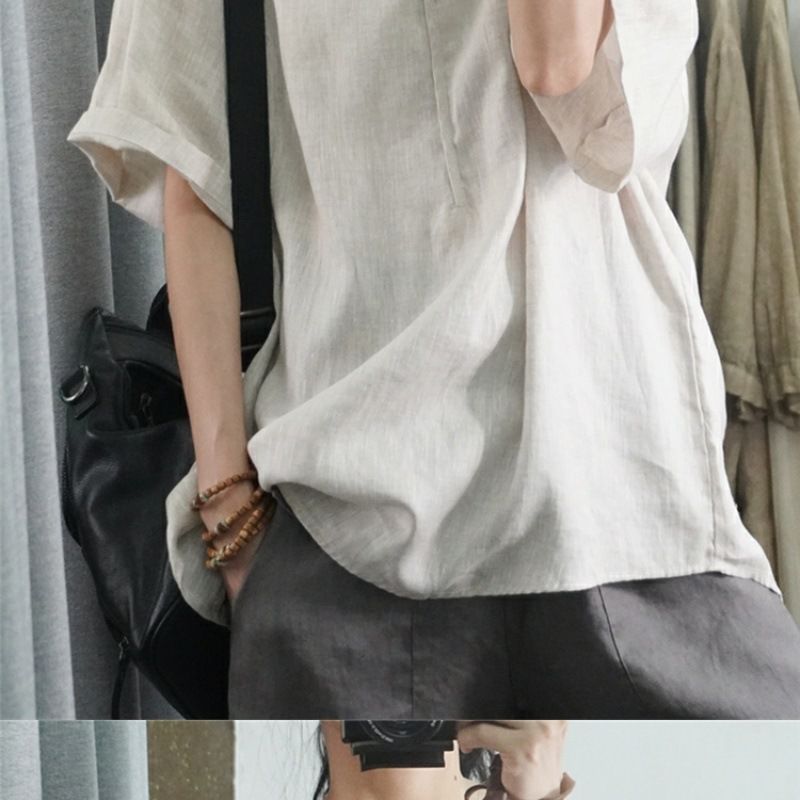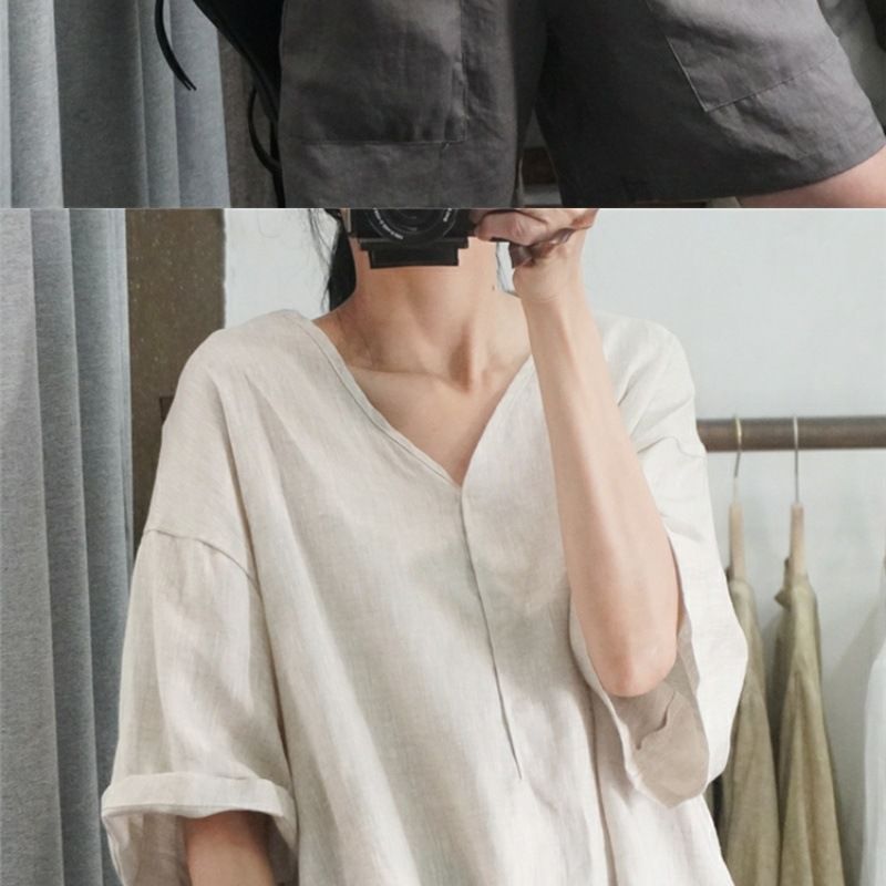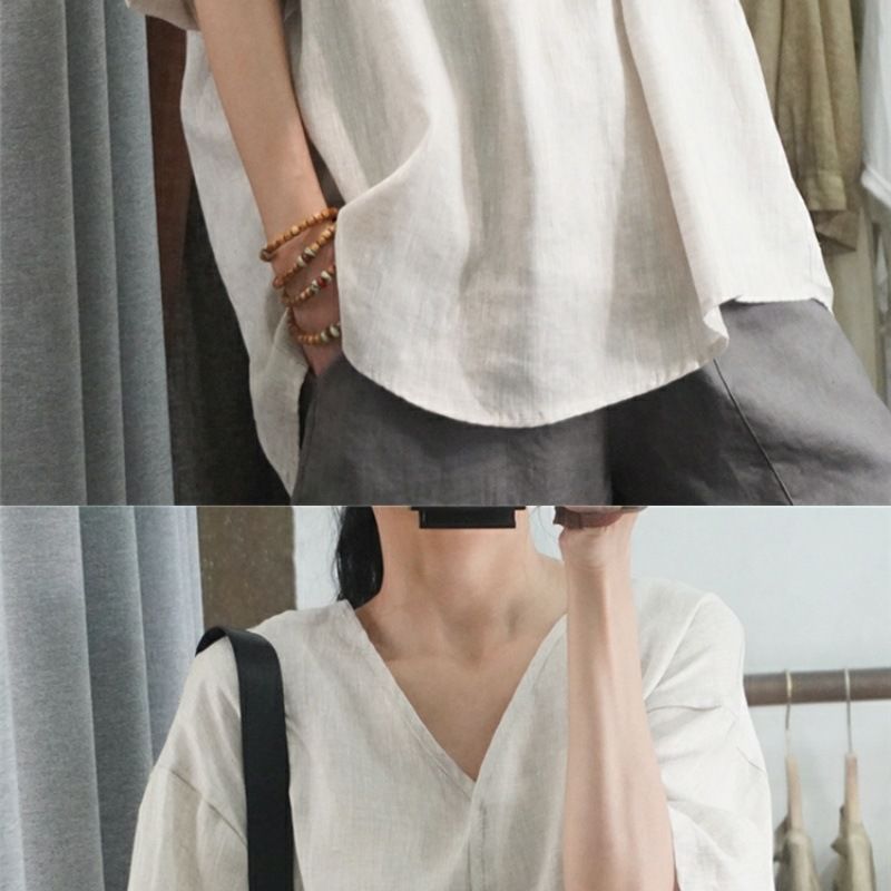 半袖棉麻休閒上衣【杏色】+【白色】各一件(到手兩件,每件均價499元)
