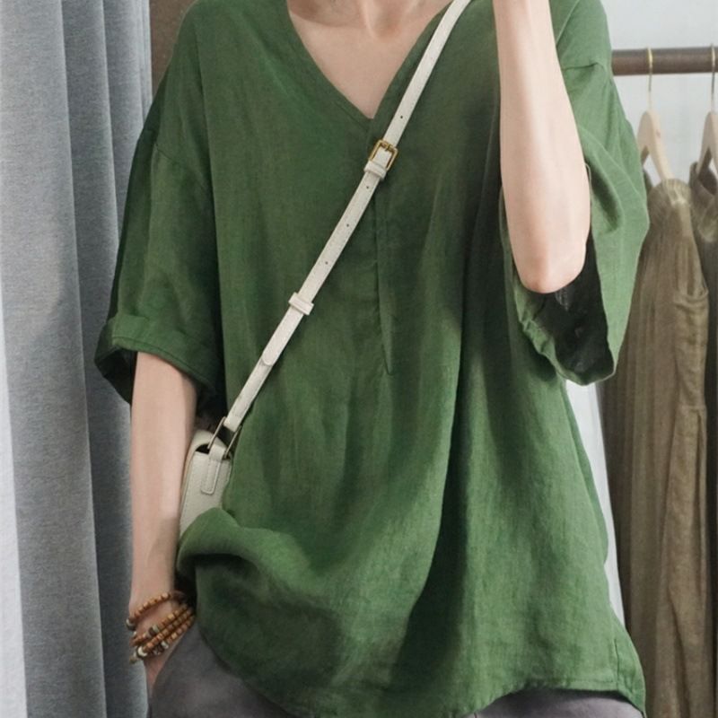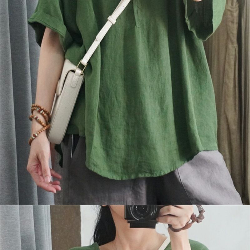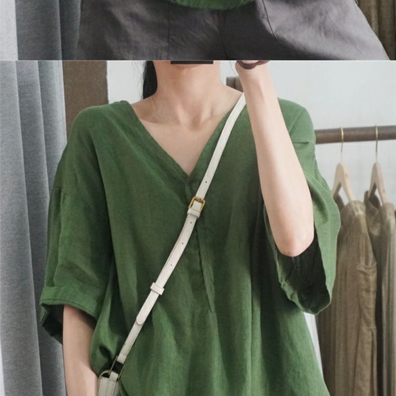 半袖棉麻休閒上衣【黑色】+【綠色】各一件(到手兩件,每件均價499元)