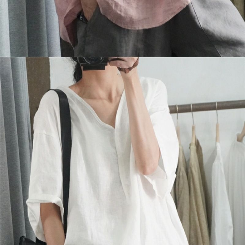 半袖棉麻休閒上衣【粉色】+【白色】各一件(到手兩件,每件均價499元)