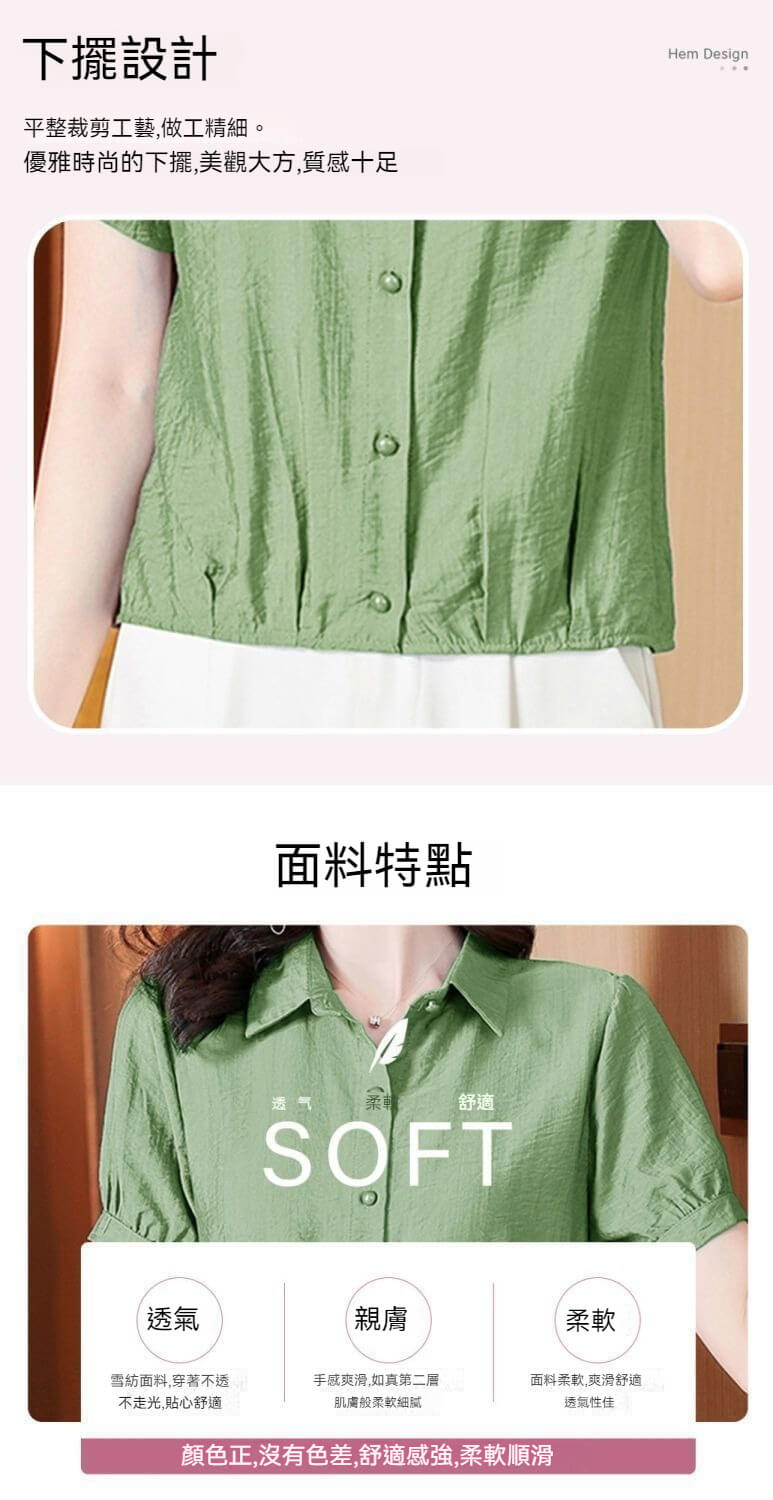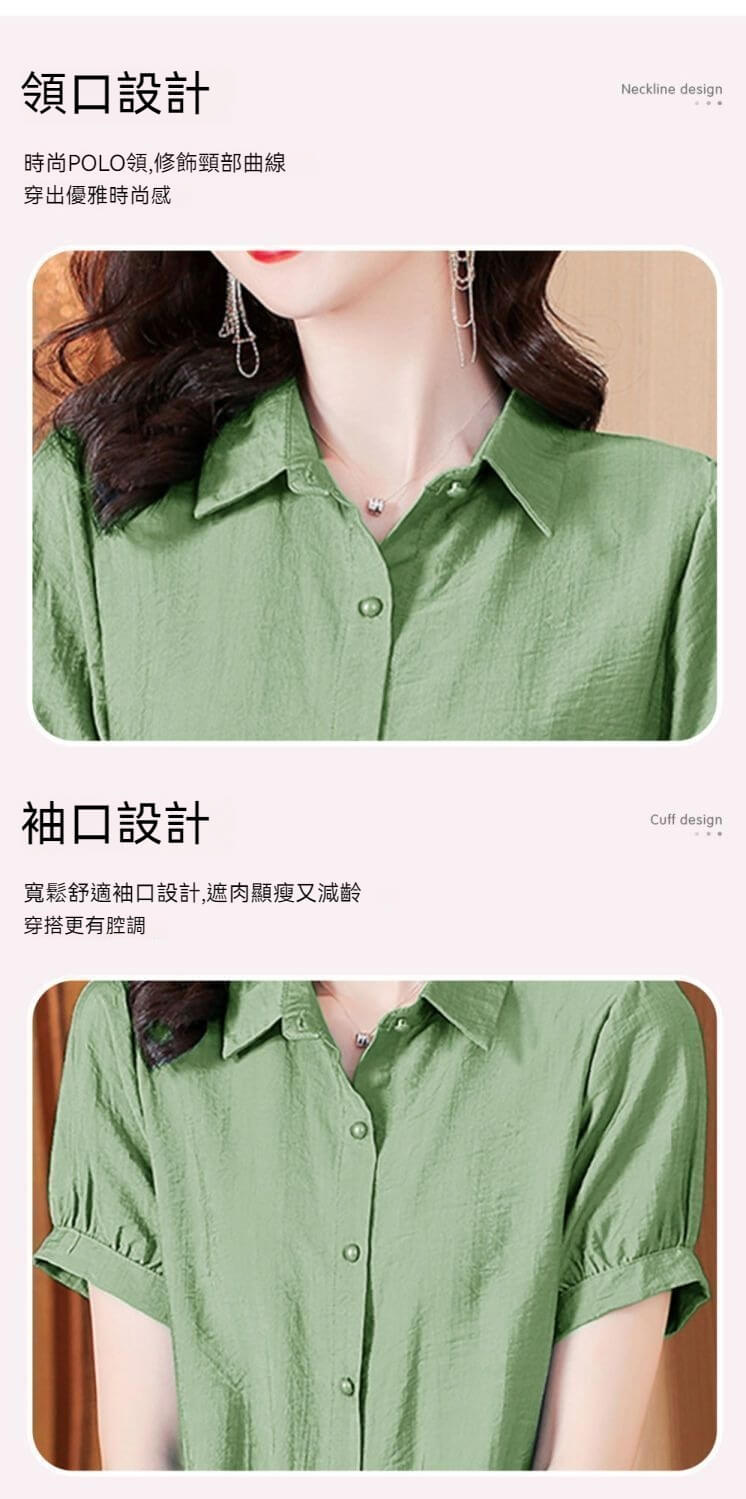 時尚顯瘦洋氣棉麻純色短袖襯衫【買一送一】【綠色】+【粉色】各一件(到手兩件,每件均價549元!)