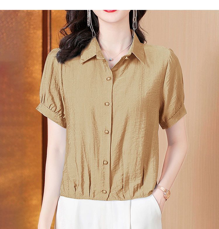 時尚顯瘦洋氣棉麻純色短袖襯衫【買一送一】【卡其色】+【粉色】各一件(到手兩件,每件均價549元!)