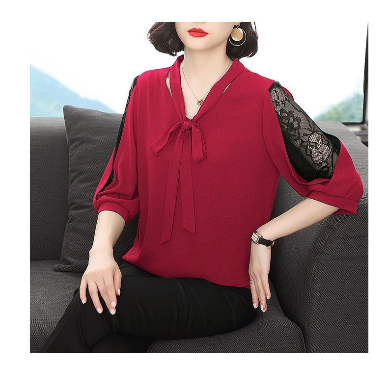 洋氣新款中年媽媽寬鬆遮肚雪紡衫【買一送一】黑色+紅色各一件(到手兩件,每件549元!)
