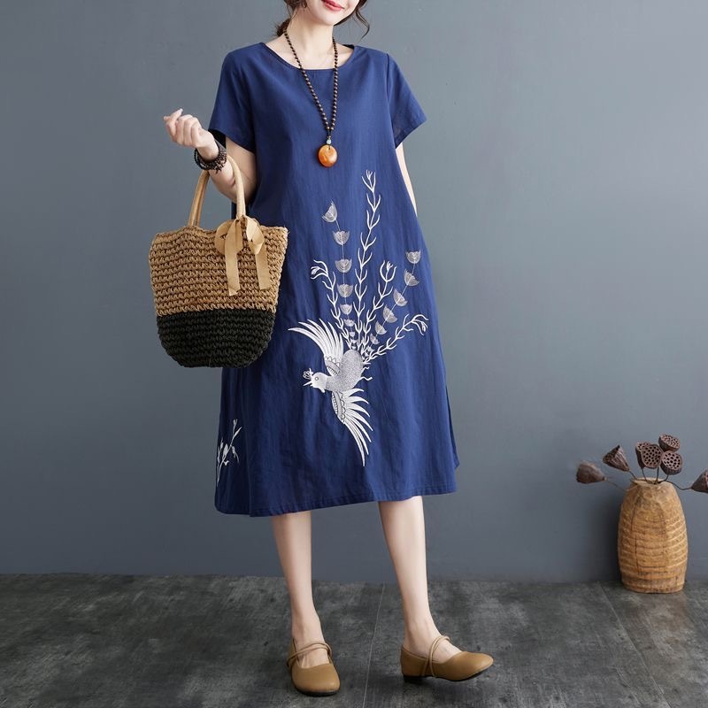 夏季遮肚顯瘦刺繡短袖連衣裙【藍色】+【黃色】各一件(到手兩件,每件均價549元)